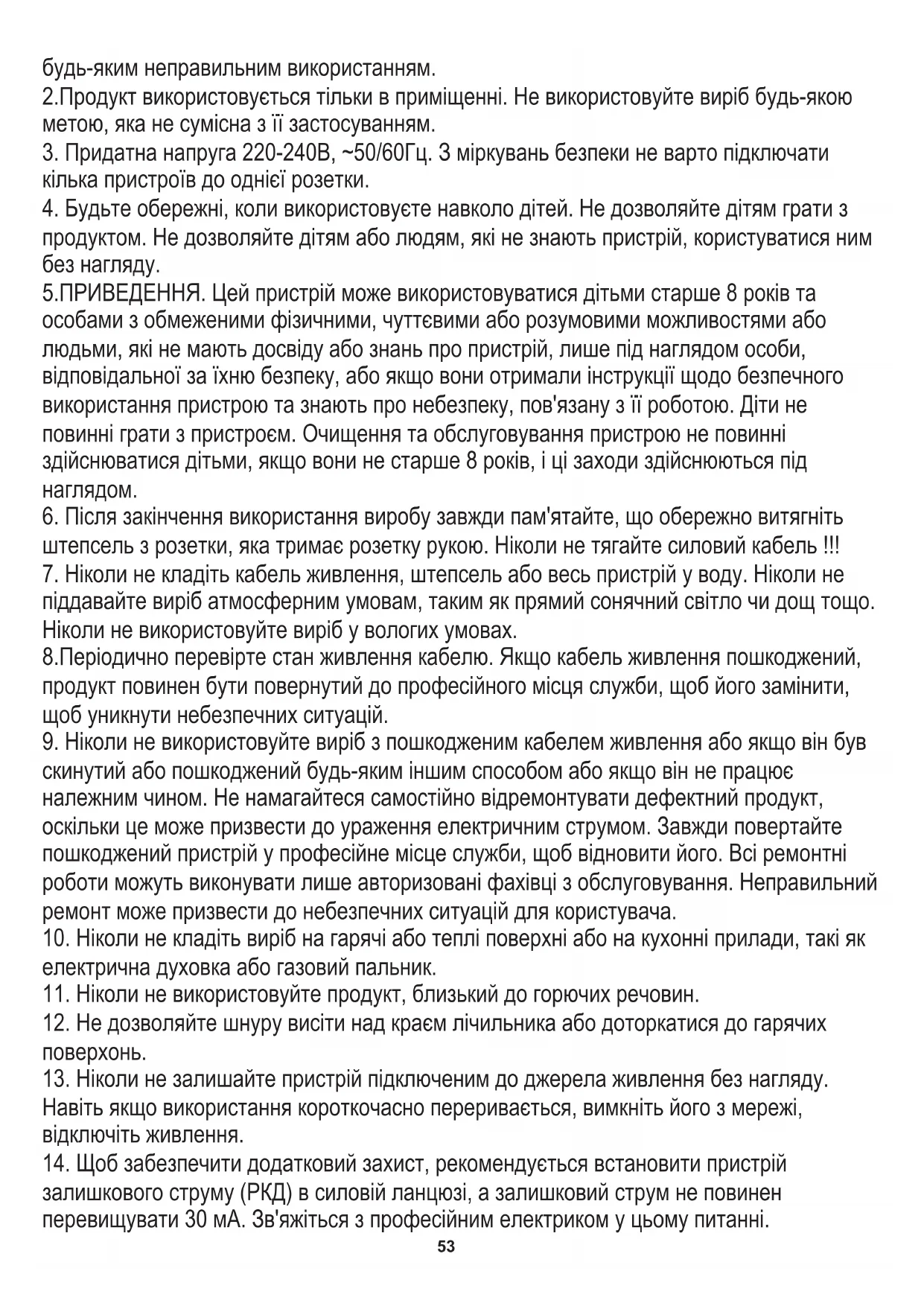 наступних інструкцій. Виробник не несе відповідальності за будь-які збитки, пов'язані з УКРАЇНСЬКА5.ПРИВЕДЕННЯ. Цей пристрій може використовуватися дітьми старше 8 років та особами з обмеженими фізичними, чуттєвими або розумовими можливостями або людьми, які не мають досвіду або знань про пристрій, лише під наглядом особи, відповідальної за їхню безпеку, або якщо вони отримали інструкції щодо безпечного використання пристрою та знають про небезпеку, пов'язану з її роботою. Діти не повинні грати з пристроєм. Очищення та обслуговування пристрою не повинні здійснюватися дітьми, якщо вони не старше 8 років, і ці заходи здійснюються під
