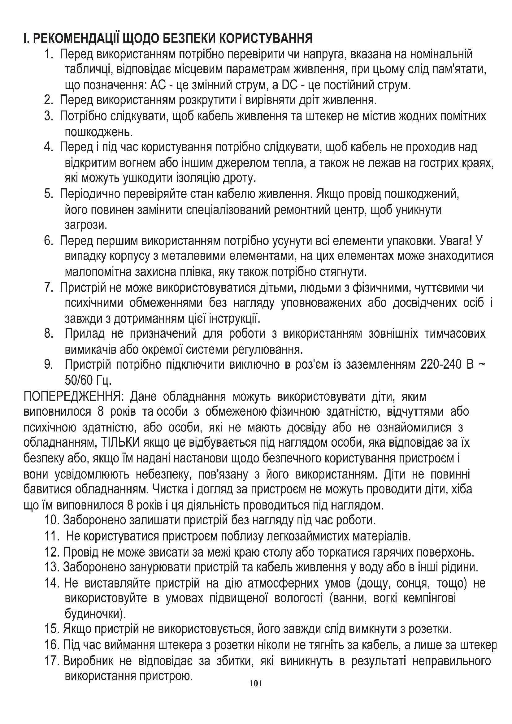 I. РЕКОМЕНДАЦІЇ ЩОДО БЕЗПЕКИ КОРИСТУВАННЯ