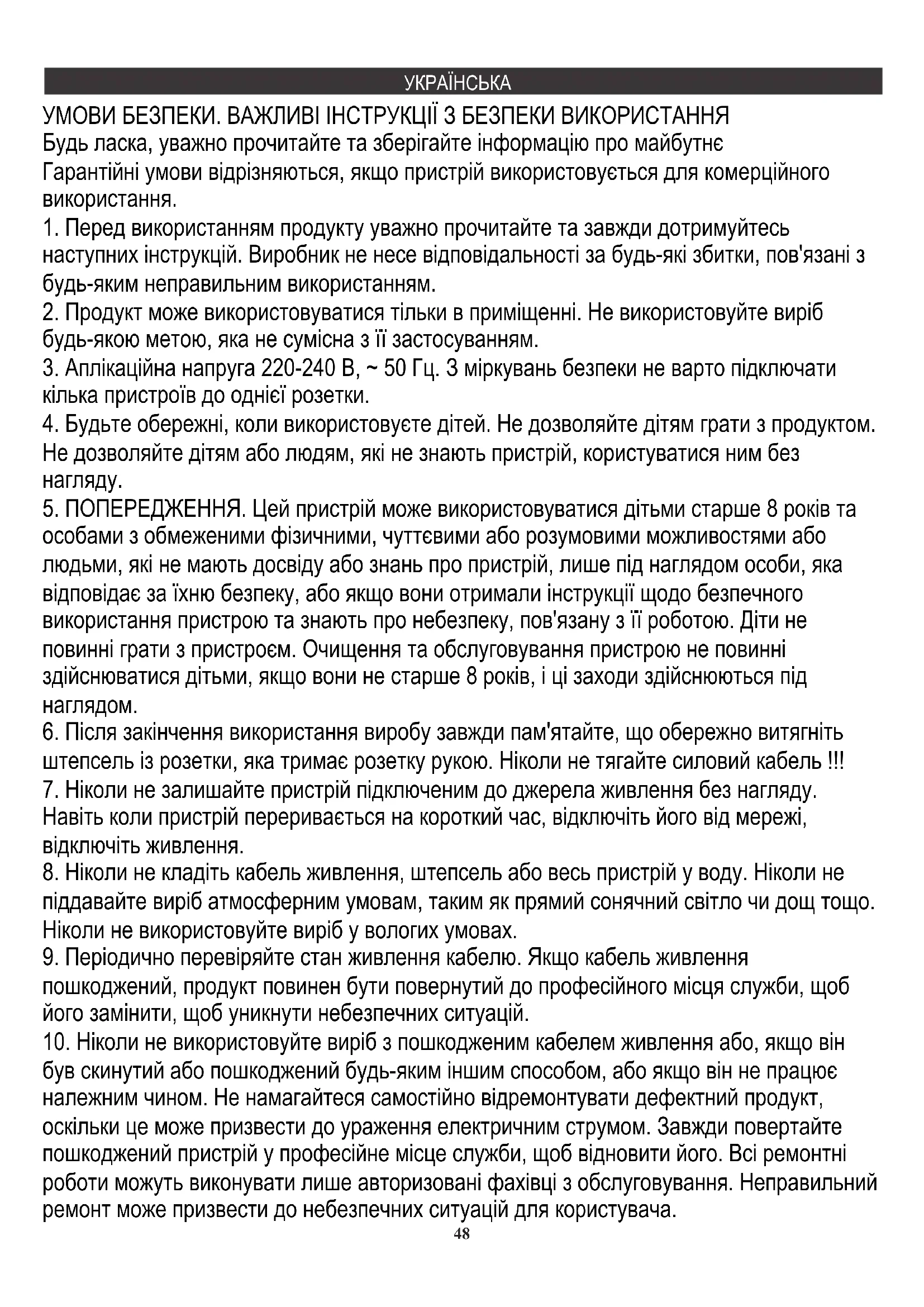 пошкоджений, продукт повинен бути повернутий до професійного місця служби, щоб його замінити, щоб уникнути небезпечних ситуацій. Будь ласка, уважно прочитайте та зберігайте інформацію про майбутнє Гарантійні умови відрізняються, якщо пристрій використовується для комерційного використання.