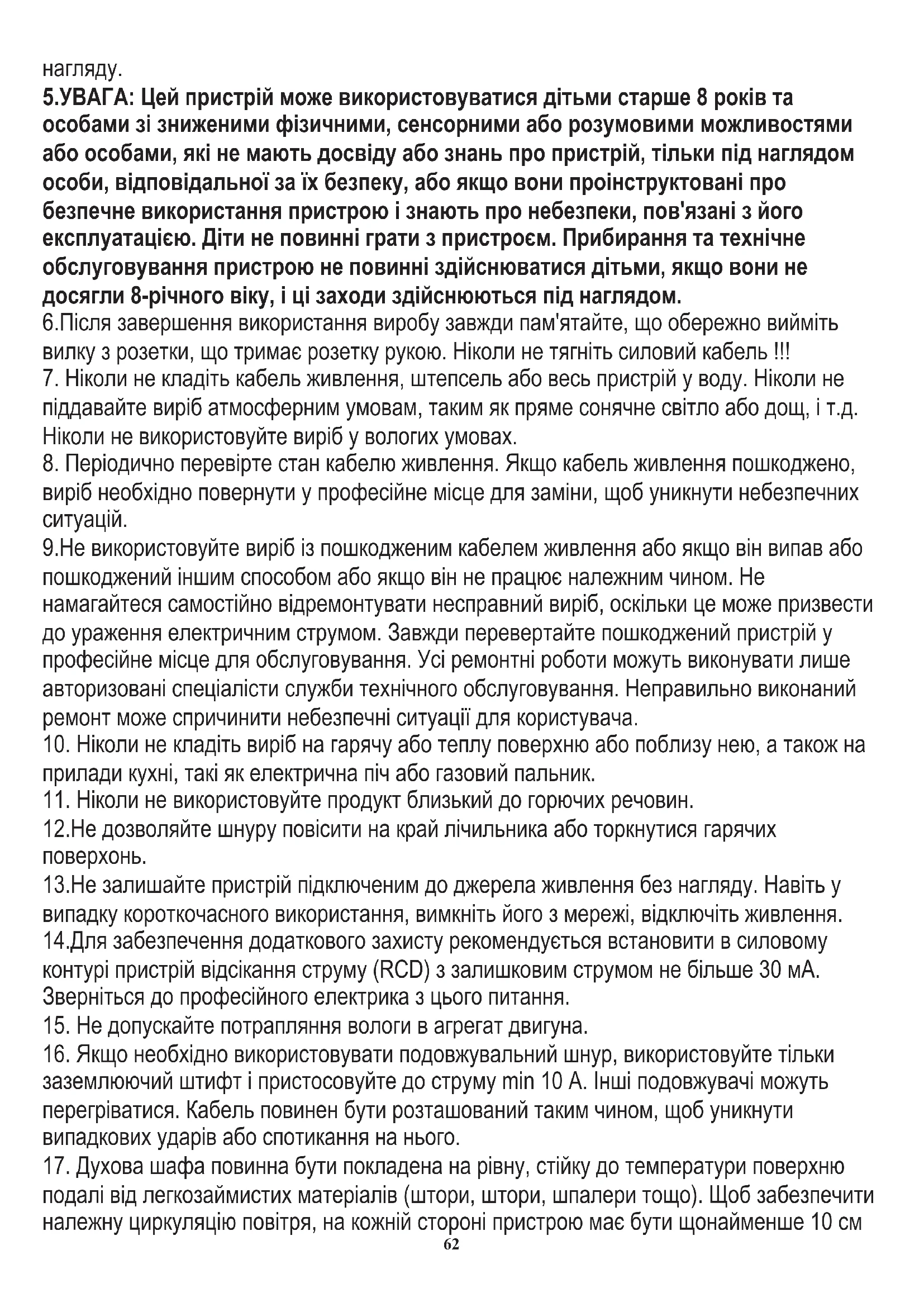 61нагляду. 5.УВАГА: Цей пристрій може використовуватися дітьми старше 8 років та особами зі зниженими фізичними, сенсорними або розумовими можливостями або особами, які не мають досвіду або знань про пристрій, тільки під наглядом особи, відповідальної за їх безпеку, або якщо вони проінструктовані про безпечне використання пристрою і знають про небезпеки, пов'язані з його експлуатацією. Діти не повинні грати з пристроєм. Прибирання та технічне обслуговування пристрою не повинні здійснюватися дітьми, якщо вони не досягли 8-річного віку, і ці заходи здійснюються під наглядом. 6.Після завершення використання виробу завжди пам'ятайте, що обережно вийміть вилку з розетки, що тримає розетку рукою. Ніколи не тягніть силовий кабель !!!