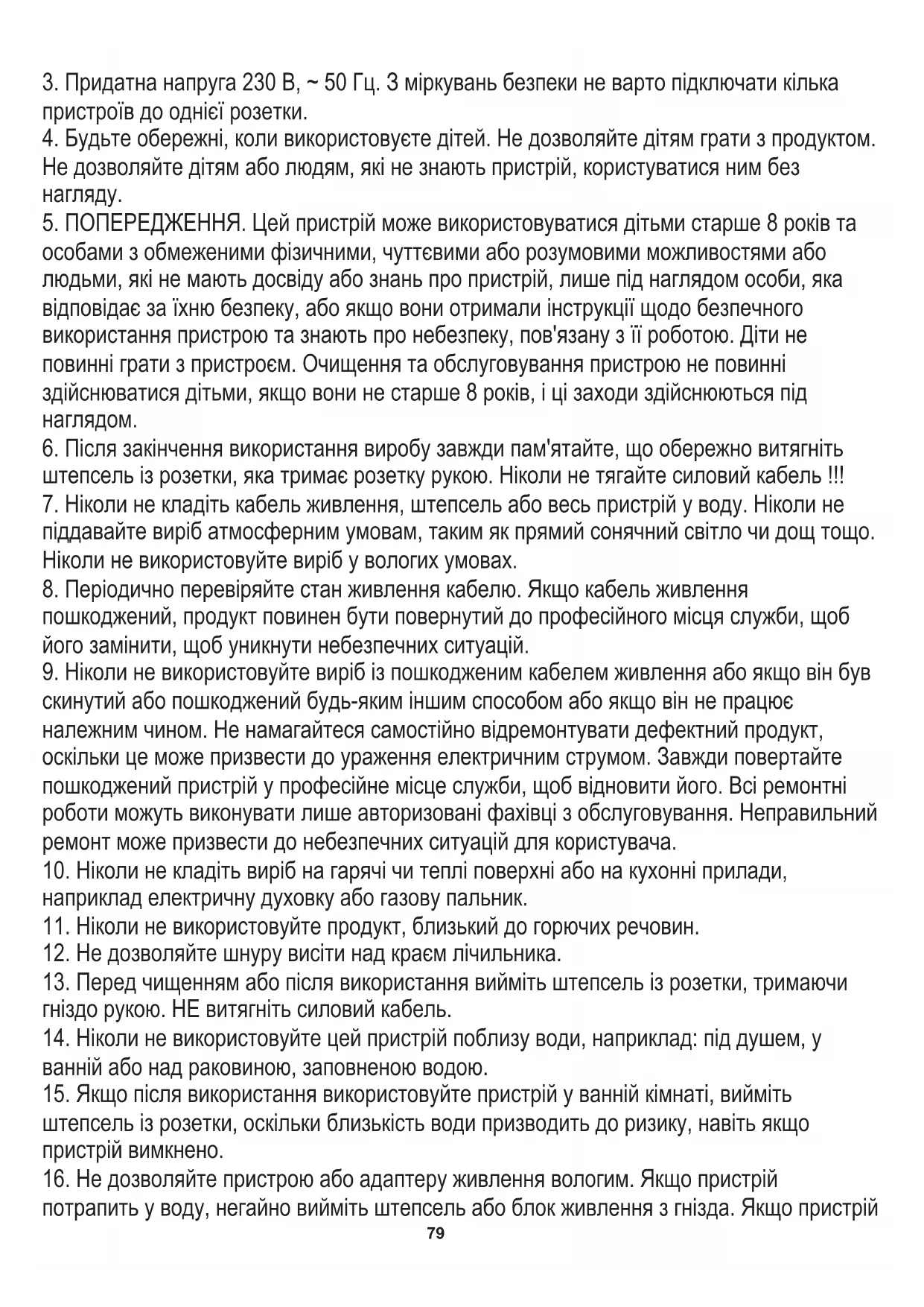 особами з обмеженими фізичними, чуттєвими або розумовими можливостями або людьми, які не мають досвіду або знань про пристрій, лише під наглядом особи, яка відповідає за їхню безпеку, або якщо вони отримали інструкції щодо безпечного використання пристрою та знають про небезпеку, пов'язану з її роботою. Діти не повинні грати з пристроєм. Очищення та обслуговування пристрою не повинні здійснюватися дітьми, якщо вони не старше 8 років, і ці заходи здійснюються під