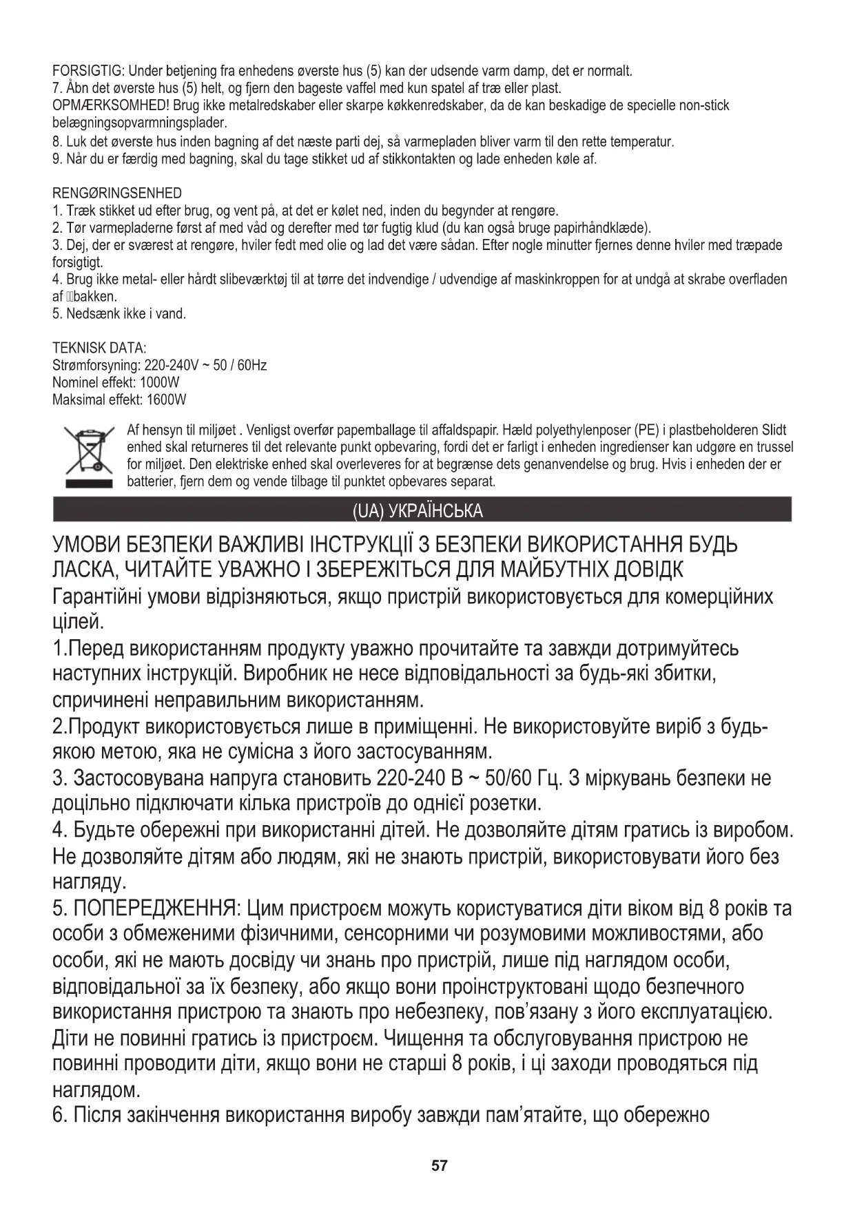 температури.60 Живлення: 220-240 В ~ 50/60 Гц Номінальна потужність: 1000 Вт Максимальна потужність: 1600 Вт ТЕХНІЧНІ ДАНІ: У інтересах навколишнього середовища. Будь ласка, віддайте картонну упаковку в місце збору мукулатури. Політиленові мішки (PE) викинути в смітник для пластику. Відпрацьований пристрій повинен бути відправлений у відповідну точку зберігання, тому що в пристрої є небезпечні інгредієнти, які можуть становити загрозу навколишньому середовищу. Електричний пристрій потрібно повернути так, щоб обмежити його повторне використання. Якщо у пристрої є батерейки, то потрібно їх витягнути і віддати до відповідного пунтку.