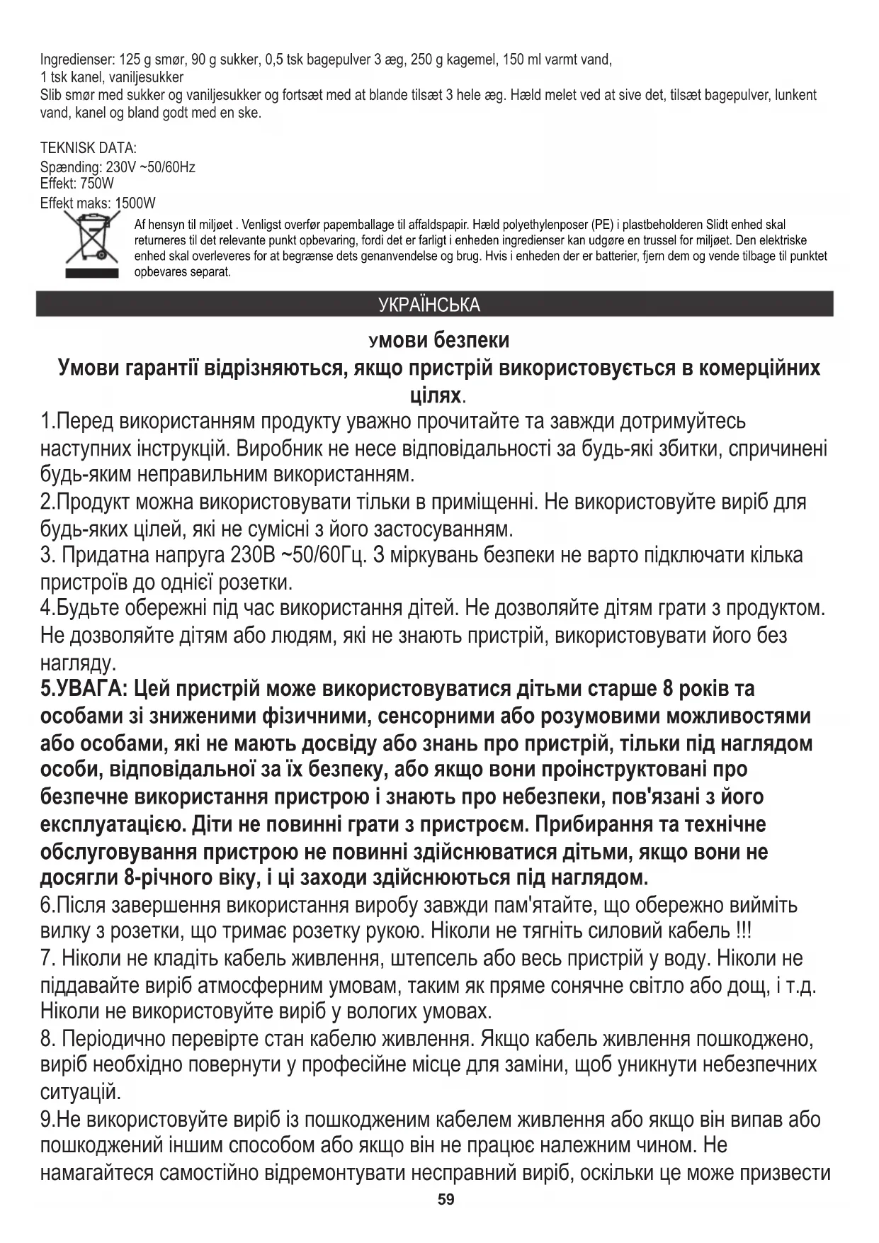 ТЕХНІЧНІ ДАНІ: Потужність: 750 Вт У інтересах навколишнього середовища. Будь ласка, віддайте картонну упаковку в місце збору мукулатури. Політиленові мішки (PE) викинути в смітник для пластику. Відпрацьований пристрій повинен бути відправлений у відповідну точку зберігання, тому що в пристрої є небезпечні інгредієнти, які можуть становити загрозу навколишньому середовищу. Електричний пристрій потрібно повернути так, щоб обмежити його повторне використання. Якщо у пристрої є батерейки, то потрібно їх витягнути і віддати до відповідного пунтку.63