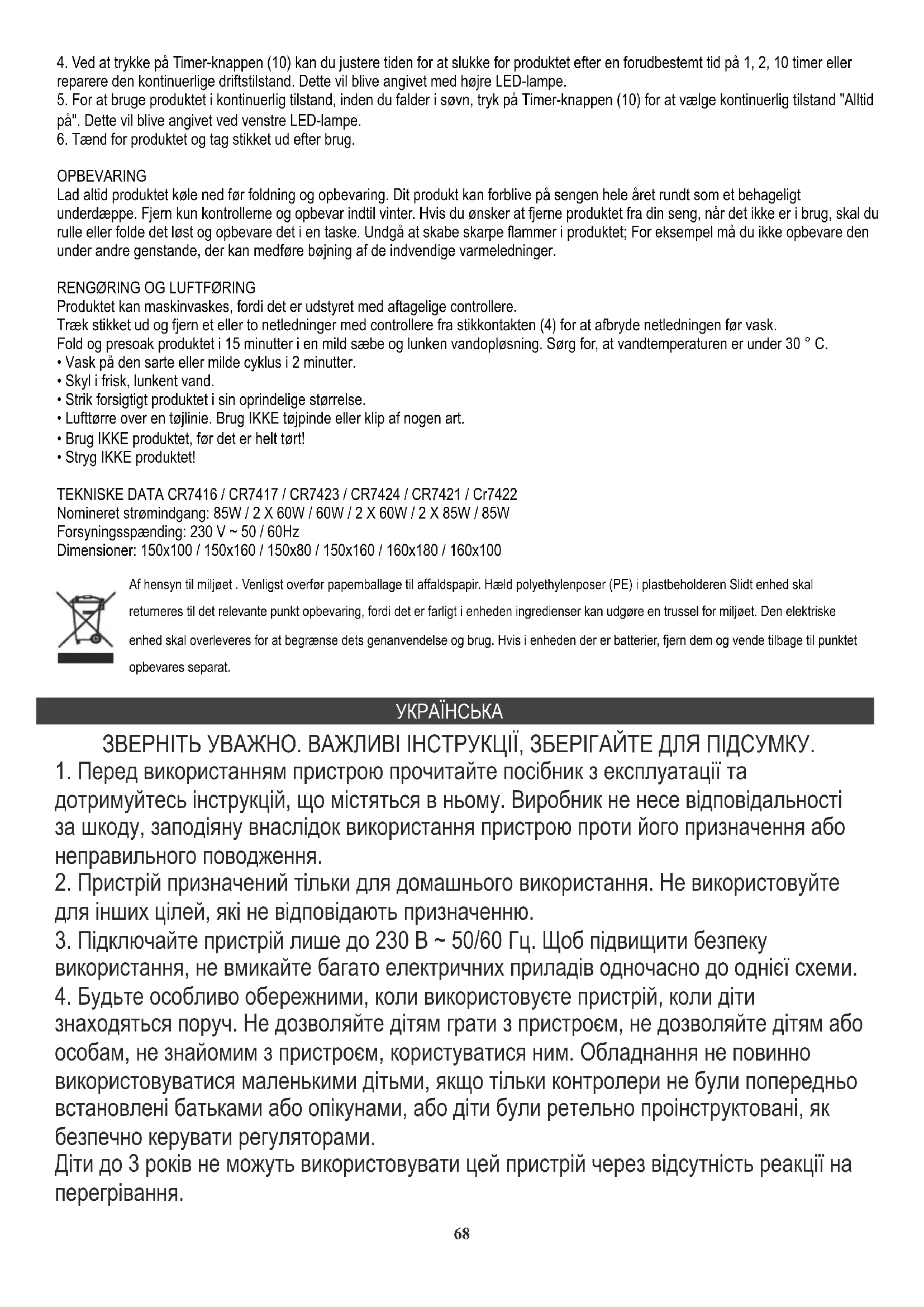 - НЕ прасуйте виріб! ТЕХНІЧНІ ДАНІ CR7416 / CR7417 / CR7423 / CR7424 / CR7421 / Cr7422 Номінальна потужність: 85W / 2 X 60W / 60W / 2 X 60W / 2 X 85W / 85W Напруга живлення: 230 В ~ 50/60 Гц Розміри: 150x100 / 150x160 / 150x80 / 150x160 / 160x180 / 160x100 У інтересах навколишнього середовища. Будь ласка, віддайте картонну упаковку в місце збору мукулатури. Політиленові мішки (PE) викинути в смітник для пластику. Відпрацьований пристрій повинен бути відправлений у відповідну точку зберігання, тому що в пристрої є небезпечні інгредієнти, які можуть становити загрозу навколишньому середовищу. Електричний пристрій потрібно повернути так, щоб обмежити його повторне використання. Якщо у пристрої є батерейки, то потрібно їх витягнути і віддати до відповідного пунтку. 71СРПСКИ МОЛИМО ЧИТАЈТЕ ПАЖЉИВО. ВАЖНЕ УПУТЕ, ЧУВАЈТЕ ЗА КАСНИЈУ УПОТРЕБУ.