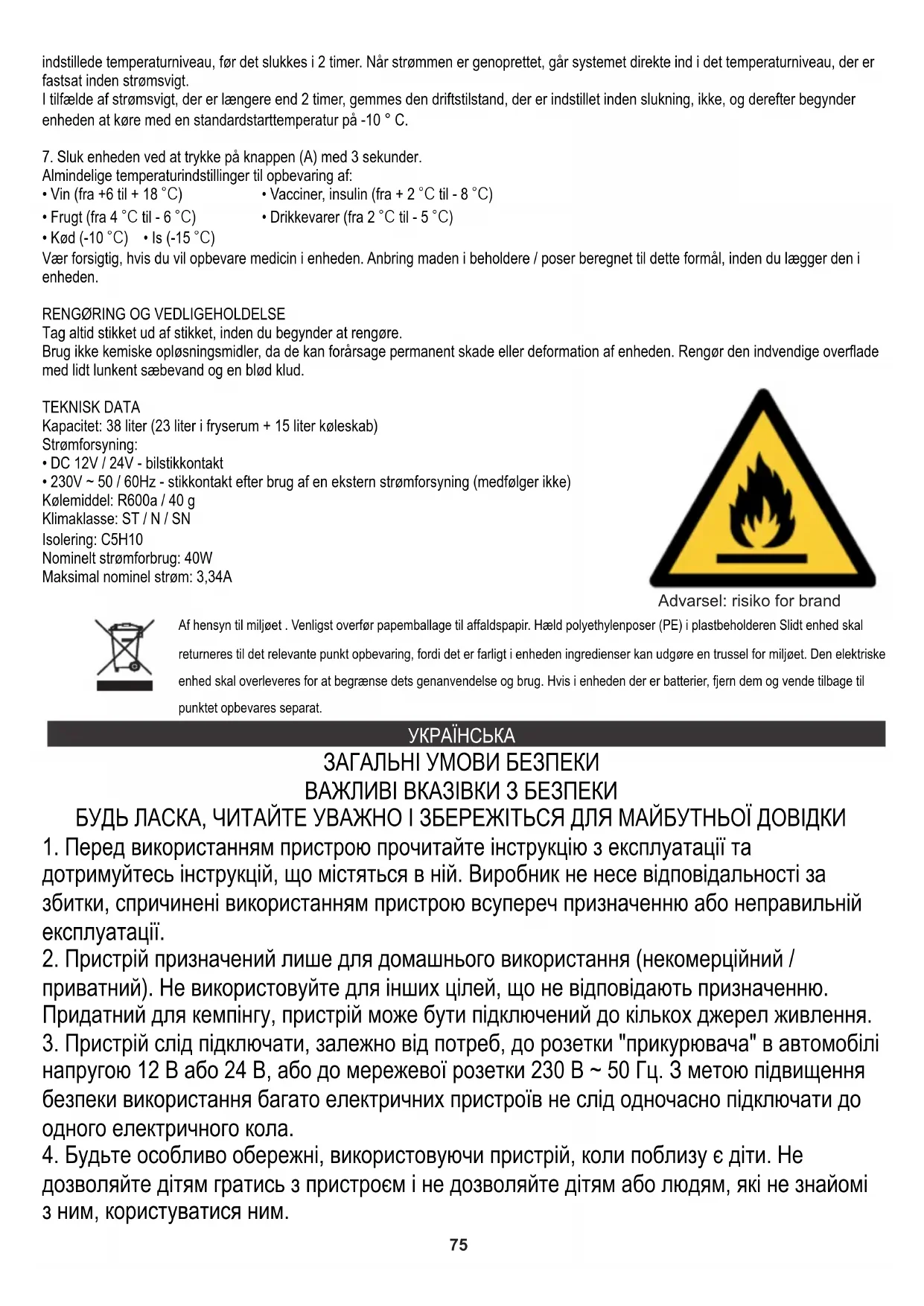 - М'ясо (-10 ℃) • Морозиво (-15 ℃) Будьте обережні, якщо ви хочете зберігати наркотики в пристрої. Покладіть продукти в призначені для цього контейнери / мішки перед тим, як покласти їх у пристрій. ОЧИСТКА ТА ОБСЛУГОВУВАННЯ Завжди відключайте пристрій від мережі, перш ніж починати чищення. Не використовуйте хімічні розчинники, оскільки вони можуть призвести до постійних пошкоджень або деформацій пристрою. Очистіть внутрішню поверхню невеликою кількістю теплої мильної води та м’якої тканини. ТЕХНІЧНІ ДАНІ Ємність: 38 літрів (23 літри в морозильній камері + 15 літрів у холодильнику) Блок живлення: