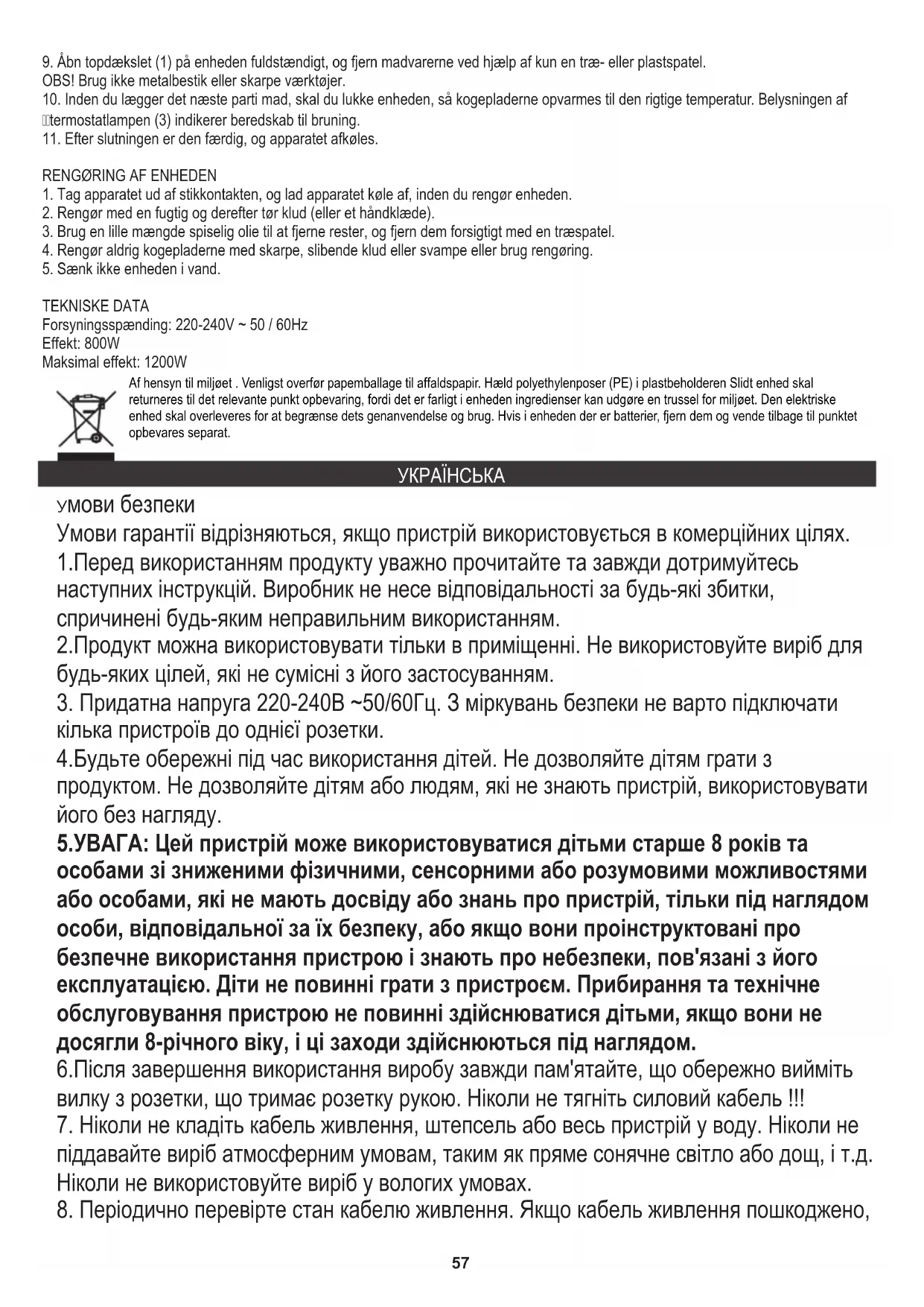 Maksimal effekt: 1200W Effekt: 800W Forsyningsspænding: 220-240V ~ 50 / 60Hz TEKNISKE DATA Af hensyn til miljøet . Venligst overfør papemballage til affaldspapir. Hæld polyethylenposer (PE) i plastbeholderen Slidt enhed skal returneres til det relevante punkt opbevaring, fordi det er farligt i enheden ingredienser kan udgøre en trussel for miljøet. Den elektriske enhed skal overleveres for at begrænse dets genanvendelse og brug. Hvis i enheden der er batterier, fjern dem og vende tilbage til punktet opbevares separat. 4.Будьте обережні під час використання дітей. Не дозволяйте дітям грати з продуктом. Не дозволяйте дітям або людям, які не знають пристрій, використовувати його без нагляду. 6.Після завершення використання виробу завжди пам'ятайте, що обережно вийміть вилку з розетки, що тримає розетку рукою. Ніколи не тягніть силовий кабель !!!