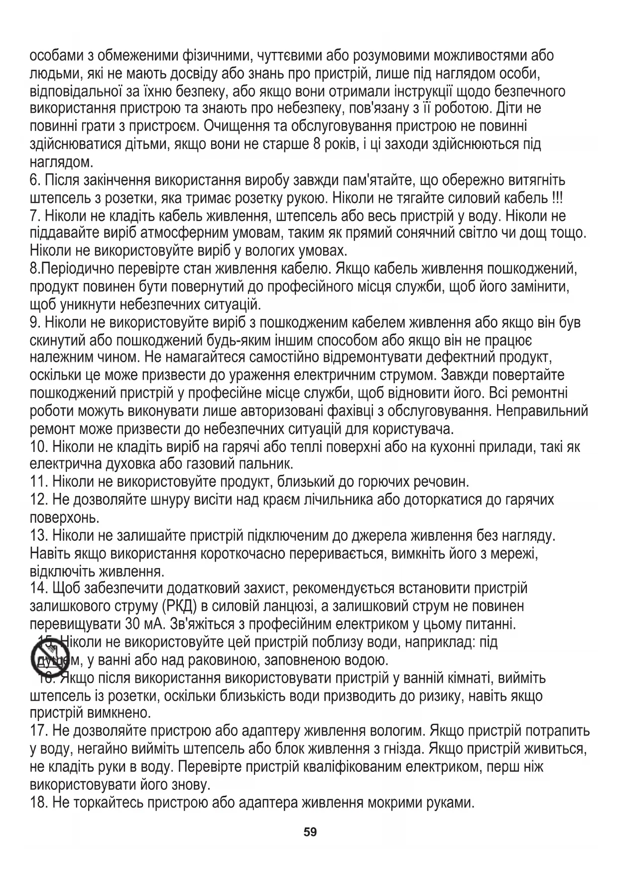 13. Ніколи не залишайте пристрій підключеним до джерела живлення без нагляду.