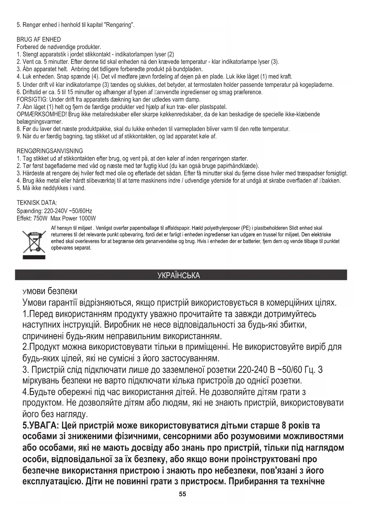 Af hensyn til miljøet . Venligst overfør papemballage til affaldspapir. Hæld polyethylenposer (PE) i plastbeholderen Slidt enhed skal returneres til det relevante punkt opbevaring, fordi det er farligt i enheden ingredienser kan udgøre en trussel for miljøet. Den elektriske enhed skal overleveres for at begrænse dets genanvendelse og brug. Hvis i enheden der er batterier, fjern dem og vende tilbage til punktet opbevares separat. Умови гарантії відрізняються, якщо пристрій використовується в комерційних цілях. Умови безпеки 5.УВАГА: Цей пристрій може використовуватися дітьми старше 8 років та особами зі зниженими фізичними, сенсорними або розумовими можливостями або особами, які не мають досвіду або знань про пристрій, тільки під наглядом особи, відповідальної за їх безпеку, або якщо вони проінструктовані про безпечне використання пристрою і знають про небезпеки, пов'язані з його експлуатацією. Діти не повинні грати з пристроєм. Прибирання та технічне 4.Будьте обережні під час використання дітей. Не дозволяйте дітям грати з продуктом. Не дозволяйте дітям або людям, які не знають пристрій, використовувати його без нагляду. 2.Продукт можна використовувати тільки в приміщенні. Не використовуйте виріб для будь-яких цілей, які не сумісні з його застосуванням. 1.Перед використанням продукту уважно прочитайте та завжди дотримуйтесь наступних інструкцій. Виробник не несе відповідальності за будь-які збитки, спричинені будь-яким неправильним використанням.