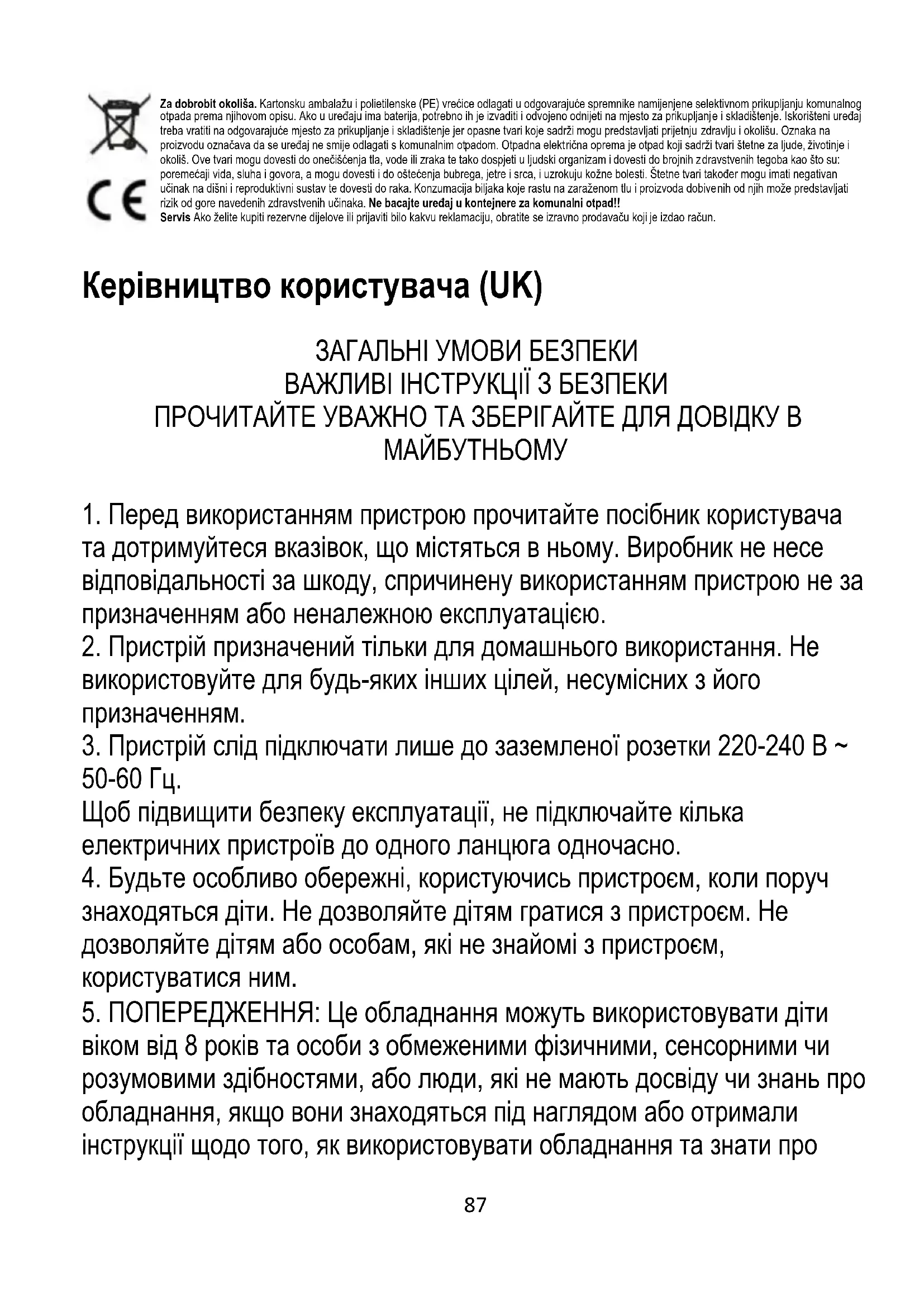 Заради довкілля. Картонну упаковку та поліетиленові (ПЕ) пакети викидати у відповідні контейнери, призначені для селективного збору побутових відходів відповідно до їх опису. Якщо в пристрої є батареї, їх слід вийняти та віднести на пункт збору та зберігання окремо. Використаний пристрій слід повернути до відповідного пункту збору та зберігання, оскільки небезпечні речовини, які він містить, можуть становити загрозу здоров’ю та навколишньому середовищу. Маркування на виробі вказує на те, що пристрій не можна викидати з побутовими відходами. Відходи електрообладнання - це відходи, які містять речовини, шкідливі для людей, тварин і навколишнього середовища. Ці речовини можуть призвести до забруднення ґрунту, води чи повітря, а отже, можуть потрапити в організм людини та призвести до численних захворювань, таких як: порушення зору, слуху та мови, а також можуть призвести до пошкодження нирок, печінки та серця, і викликають шкірні захворювання. Шкідливі речовини також можуть мати негативний вплив на дихальну та репродуктивну системи та призводити до раку. Споживання рослин, що ростуть на оскаржених ґрунтах, і продуктів, отриманих з них, може становити ризик вищезазначених наслідків для здоров’я. Не викидайте пристрій у контейнери для міських відходів!! Сервіс Якщо ви бажаєте придбати запчастини або повідомити про будь-які скарги, зв’яжіться безпосередньо з продавцем, який видав чек. Упутство за употребу (SR) ОПШТИ УСЛОВИ БЕЗБЕДНОСТИ ВАЖНА БЕЗБЕДНОСНА УПУТСТВА ПАЖЉИВО ПРОЧИТАЈТЕ И ЗАЧУВАЈТЕ ЗА БУДУЋЕ РЕФЕРЕНЦЕ