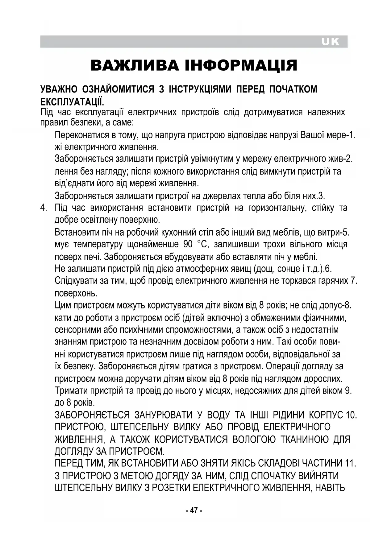 ВАЖЛИВА ІНФОРМАЦІЯ УВАЖНО ОЗНАЙОМИТИСЯ З ІНСТРУКЦІЯМИ ПЕРЕД ПОЧАТКОМ ЕКСПЛУАТАЦІЇ. Під час експлуатації електричних пристроїв слід дотримуватися належних правил безпеки, а саме: Переконатися в тому, що напруга пристрою відповідає напрузі Вашої мере-1. жі електричного живлення. Забороняється залишати пристрій увімкнутим у мережу електричного жив-2. лення без нагляду; після кожного використання слід вимкнути пристрій та від’єднати його від мережі живлення. Забороняється залишати пристрої на джерелах тепла або біля них.3. Під час використання встановити пристрій на горизонтальну, стійку та 4. добре освітлену поверхню. Встановити піч на робочий кухонний стіл або інший вид меблів, що витри-5. мує температуру щонайменше 90 °C, залишивши трохи вільного місця поверх печі. Забороняється вбудовувати або вставляти піч у меблі. Не залишати пристрій під дією атмосферних явищ (дощ, сонце і т.д.).6. Слідкувати за тим, щоб провід електричного живлення не торкався гарячих 7.