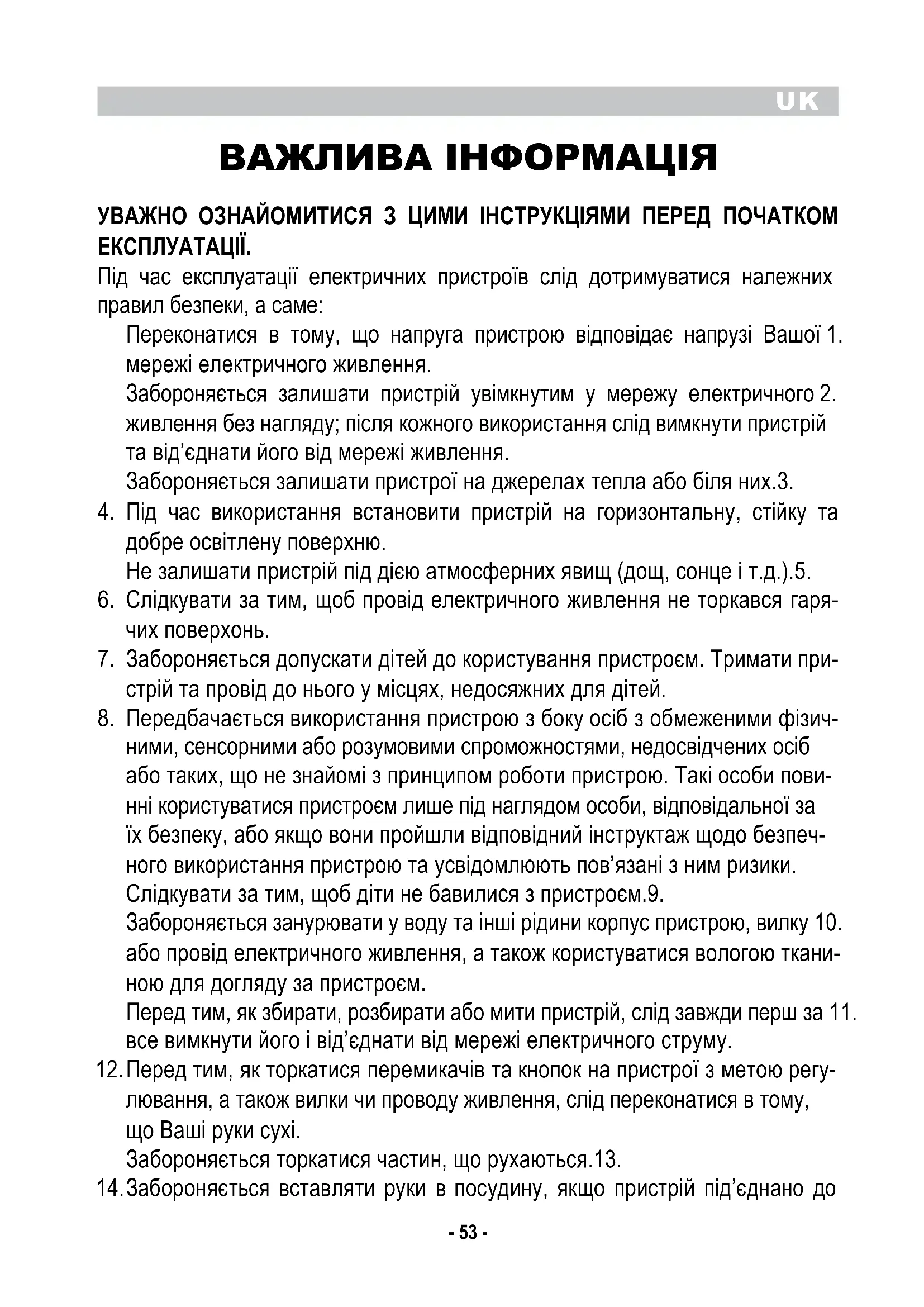 ВАЖЛИВА ІНФОРМАЦІЯ УВАЖНО ОЗНАЙОМИТИСЯ З ЦИМИ ІНСТРУКЦІЯМИ ПЕРЕД ПОЧАТКОМ ЕКСПЛУАТАЦІЇ. Під час експлуатації електричних пристроїв слід дотримуватися належних правил безпеки, а саме: Переконатися в тому, що напруга пристрою відповідає напрузі Вашої 1. мережі електричного живлення. Забороняється залишати пристрій увімкнутим у мережу електричного 2. живлення без нагляду; після кожного використання слід вимкнути пристрій та від’єднати його від мережі живлення. Забороняється залишати пристрої на джерелах тепла або біля них.3. Під час використання встановити пристрій на горизонтальну, стійку та 4. добре освітлену поверхню. Не залишати пристрій під дією атмосферних явищ (дощ, сонце і т.д.).5. Слідкувати за тим, щоб провід електричного живлення не торкався гаря-6. чих поверхонь. Забороняється допускати дітей до користування пристроєм. Тримати при-7. стрій та провід до нього у місцях, недосяжних для дітей. Передбачається використання пристрою з боку осіб з обмеженими фізич-8. ними, сенсорними або розумовими спроможностями, недосвідчених осіб або таких, що не знайомі з принципом роботи пристрою. Такі особи пови- нні користуватися пристроєм лише під наглядом особи, відповідальної за їх безпеку, або якщо вони пройшли відповідний інструктаж щодо безпеч- ного використання пристрою та усвідомлюють пов’язані з ним ризики. Слідкувати за тим, щоб діти не бавилися з пристроєм.9. Забороняється занурювати у воду та інші рідини корпус пристрою, вилку 10. або провід електричного живлення, а також користуватися вологою ткани- ною для догляду за пристроєм. Перед тим, як збирати, розбирати або мити пристрій, слід завжди перш за 11. все вимкнути його і від’єднати від мережі електричного струму. Перед тим, як торкатися перемикачів та кнопок на пристрої з метою регу-12. лювання, а також вилки чи проводу живлення, слід переконатися в тому, що Ваші руки сухі. Забороняється торкатися частин, що рухаються.13. Забороняється вставляти руки в посудину, якщо пристрій під’єднано до 14.UK