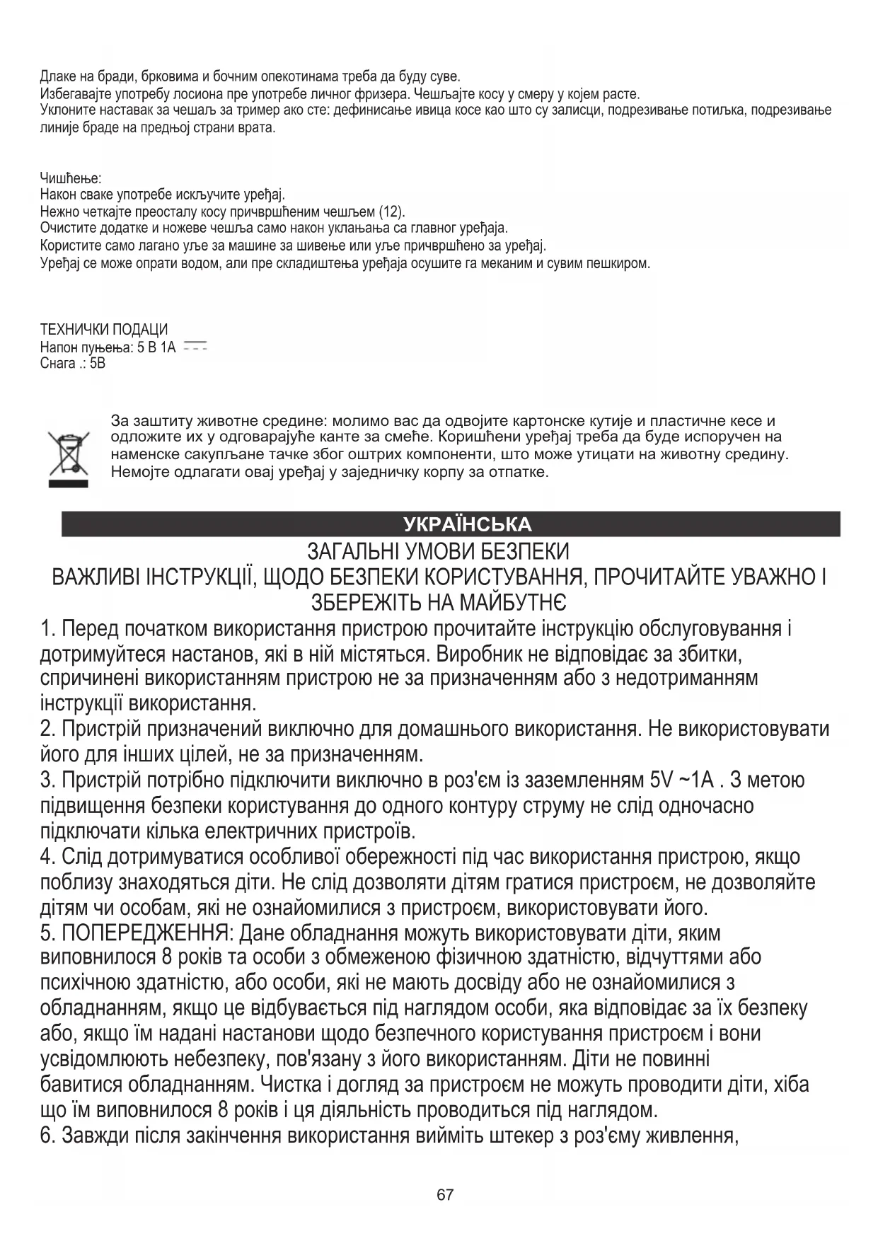 Цей набір призначений для управління довжиною та формою брів, бакенбардів та волосся на тілі. Він має додаткове кріплення, яке ви можете змінити довжину або використовувати без кріплення. Щоб зняти та прикріпити, будь ласка, зверніться до Рис. 1. При кріпленні, будь ласка, вирівняйте внутрішню частину, показану на Рис. 3 підпункту 2 з канавкою пристрою у пристрої, показаному на рис. 3 підпункт 1. Потім міцно схопіть кріплення за боки, як показано на рис. 25. Сильно притискайте пристрій до клацання.70 ПОРАДИ ПО НАЙКРАЩИМ РЕЗУЛЬТАТАМ Волосся на бороді, вусах і бакенбарді повинні бути сухими. Уникайте використання лосьйонів перед використанням особистого грумера. Розчісуйте волосся у напрямку, в якому воно росте. Зніміть кріплення гребінця тримера, якщо ви: визначаєте краї лінії волосся, такі як бакенбарди, обрізаєте потилицю, підстригаєте лінію бороди на передній частині шиї. Прибирання: Після кожного використання вимикайте пристрій. Акуратно почистіть волосся, що залишилося, прикріпленою гребінцем (12). Очищайте кріплення гребінця та лопаті лише після того, як вийняті з основного пристрою. Використовуйте лише легке масло для швейних машин або масло, прикріплене до пристрою. Пристрій можна мити водою, але перед тим, як зберігати пристрій, просушіть його м’яким сухим рушником до повного висихання. ТЕХНІЧНІ ДАНІ Напруга зарядки: 5 В 1А Потужність: 5 Вт У інтересах навколишнього середовища. Будь ласка, віддайте картонну упаковку в місце збору мукулатури. Політиленові мішки (PE) викинути в смітник для пластику. Відпрацьований пристрій повинен бути відправлений у відповідну точку зберігання, тому що в пристрої є небезпечні інгредієнти, які можуть становити загрозу навколишньому середовищу. Електричний пристрій потрібно повернути так, щоб обмежити його повторне використання. Якщо у пристрої є батерейки, то потрібно їх витягнути і віддати до відповідного пунтку. CONDIZIONI DI SICUREZZA ISTRUZIONI IMPORTANTI SULLA SICUREZZA D'USO, LEGGERE ATTENTAMENTE E CONSERVARE IL FUTURO RIFERIMENTO Le condizioni di garanzia sono diverse se il dispositivo viene utilizzato a fini commerciali. "