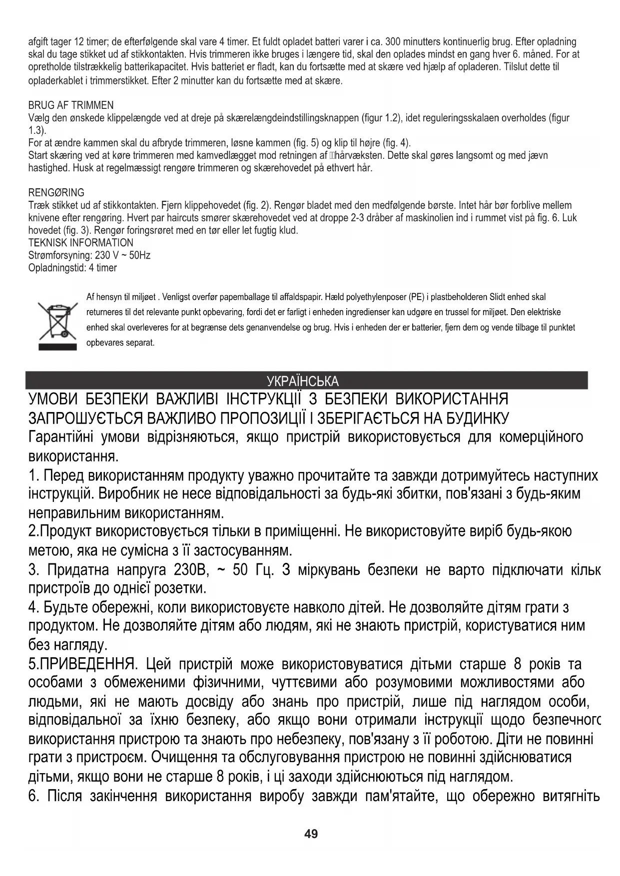 Від'єднайте пристрій від джерела живлення. Зніміть ріжучу головку (мал. 2). Очистіть ножиці за допомогою включеної щітки. Ніяке волосся не повинно залишатися між лопатями після чищення. Кожну кількість стрижок змащують ріжучої голівкою, скинувши 2-3 краплі машинного масла в пробіл, показаний на мал. 6. Закрийте головку (мал. 3). Очистіть корпус сухою або злегка вологою ганчіркою. ТЕХНІЧНА ІНФОРМАЦІЯ Джерело живлення: 230 В ~ 50Гц Час заряджання: 4 години У інтересах навколишнього середовища. Будь ласка, віддайте картонну упаковку в місце збору мукулатури. Політиленові мішки (PE) викинути в смітник для пластику. Відпрацьований пристрій повинен бути відправлений у відповідну точку зберігання, тому що в пристрої є небезпечні інгредієнти, які можуть становити загрозу навколишньому середовищу. Електричний пристрій потрібно повернути так, щоб обмежити його повторне використання. Якщо у пристрої є батерейки, то потрібно їх витягнути і віддати до відповідного пунтку. 51SIGURNOSNI UVJETI VAŽNE UPUTE O SIGURNOSTI UPORABE MOLIMO VAS DA PROČITAJTE I ČUVAJTE ZA BUDUĆE REFERENCE Uvjeti jamstva se razlikuju, ako se uređaj koristi u komercijalne svrhe.