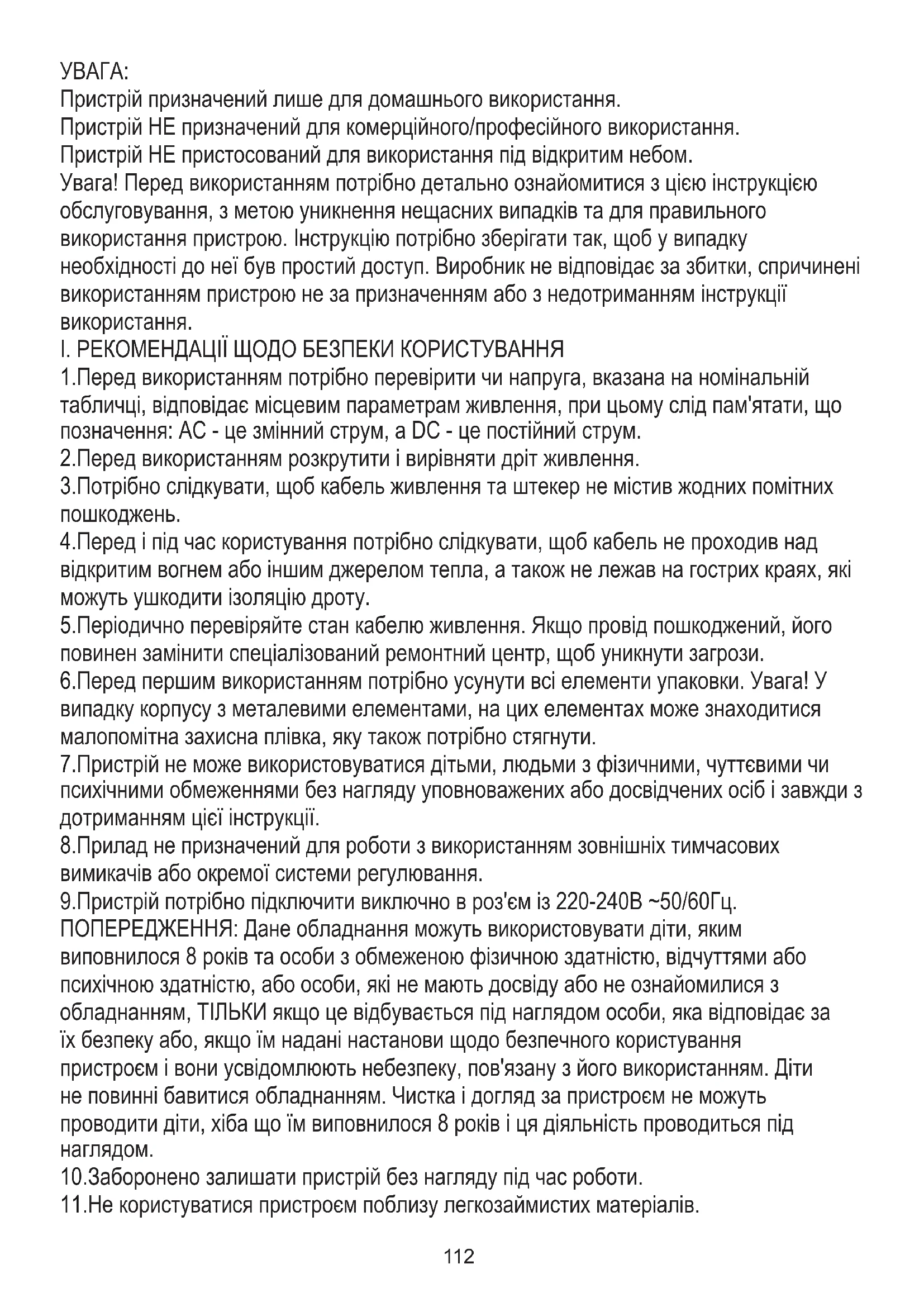 Пристрій призначений лише для домашнього використання. Увага! Перед використанням потрібно детально ознайомитися з цією інструкцією обслуговування, з метою уникнення нещасних випадків та для правильного використання пристрою. Інструкцію потрібно зберігати так, щоб у випадку необхідності до неї був простий доступ. Виробник не відповідає за збитки, спричинені використанням пристрою не за призначенням або з недотриманням інструкції використання.