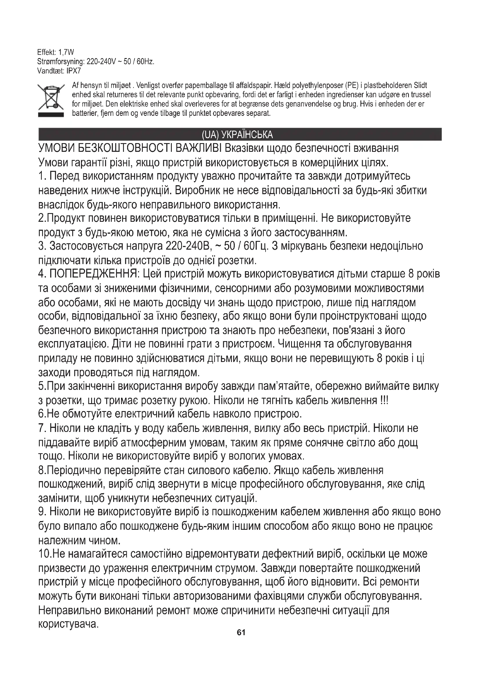 Навіть коли використання перервано на короткий час, вимкніть його з мережі, відключіть живлення. 16.Для забезпечення додаткового захисту рекомендується встановити пристрій струму залишків струму (RCD) в ланцюзі живлення з номінальним залишковим струмом не більше 30 мА. З цього питання зверніться до професійного електрика.
