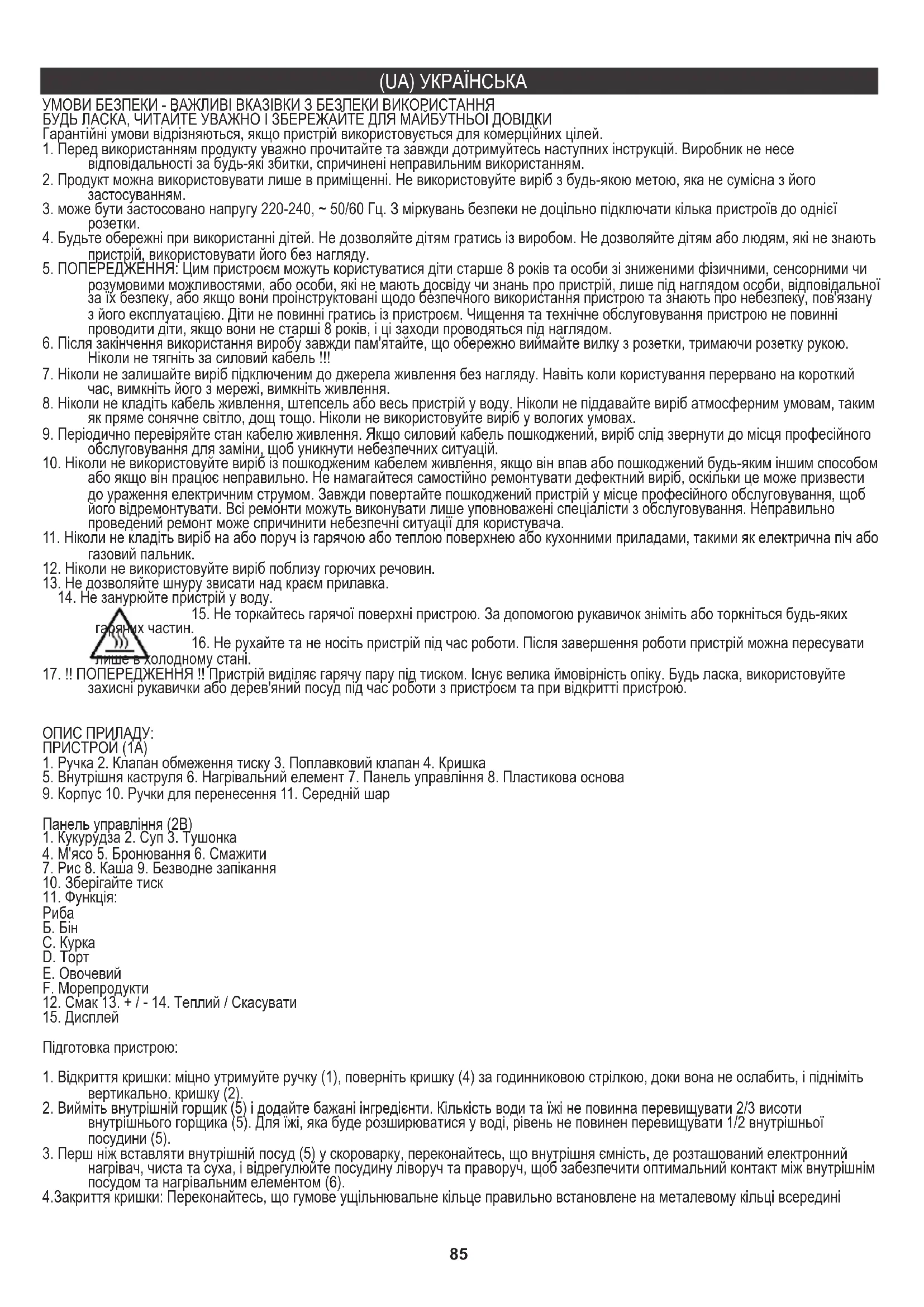 лише в холодному стані. 17. !! ПОПЕРЕДЖЕННЯ !! Пристрій виділяє гарячу пару під тиском. Існує велика ймовірність опіку. Будь ласка, використовуйте захисні рукавички або дерев'яний посуд під час роботи з пристроєм та при відкритті пристрою.