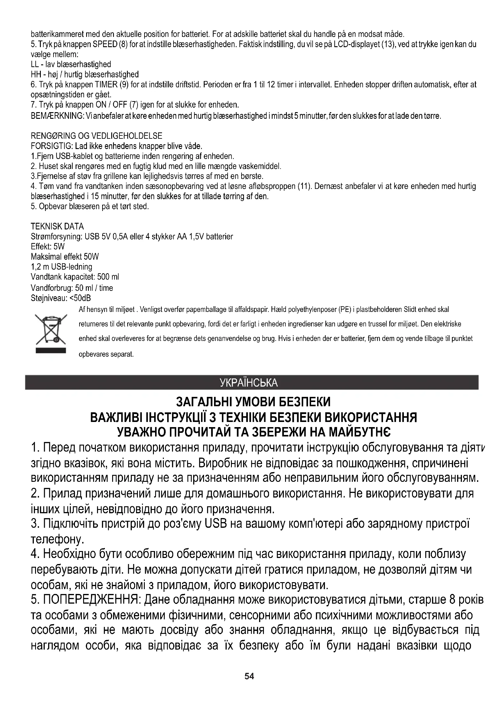 інших цілей, невідповідно до його призначення. ЗАГАЛЬНІ УМОВИ БЕЗПЕКИ Vandtank kapacitet: 500 ml Støjniveau: <50dB ВАЖЛИВІ ІНСТРУКЦІЇ З ТЕХНІКИ БЕЗПЕКИ ВИКОРИСТАННЯ УВАЖНО ПРОЧИТАЙ ТА ЗБЕРЕЖИ НА МАЙБУТНЄ Vandforbrug: 50 ml / time