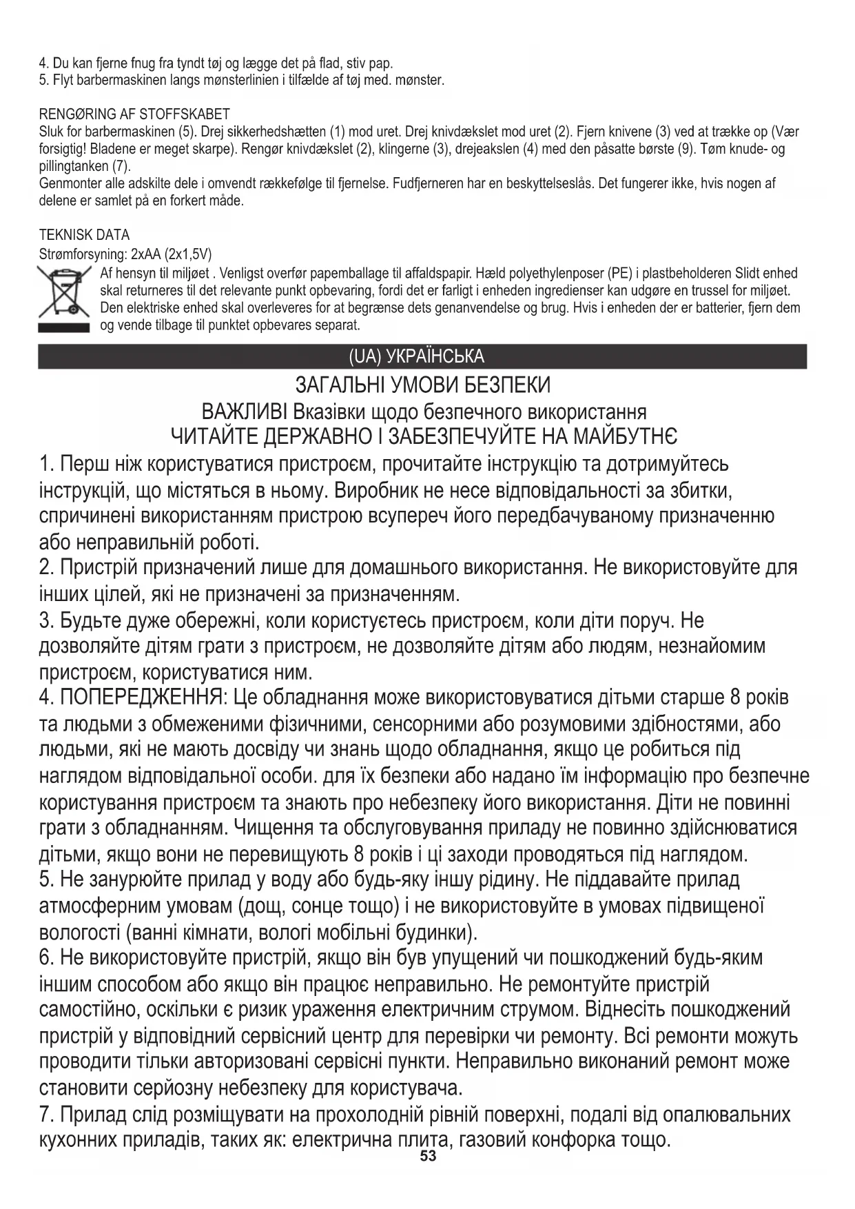 та людьми з обмеженими фізичними, сенсорними або розумовими здібностями, або людьми, які не мають досвіду чи знань щодо обладнання, якщо це робиться під наглядом відповідальної особи. для їх безпеки або надано їм інформацію про безпечне користування пристроєм та знають про небезпеку його використання. Діти не повинні грати з обладнанням. Чищення та обслуговування приладу не повинно здійснюватися дітьми, якщо вони не перевищують 8 років і ці заходи проводяться під наглядом.