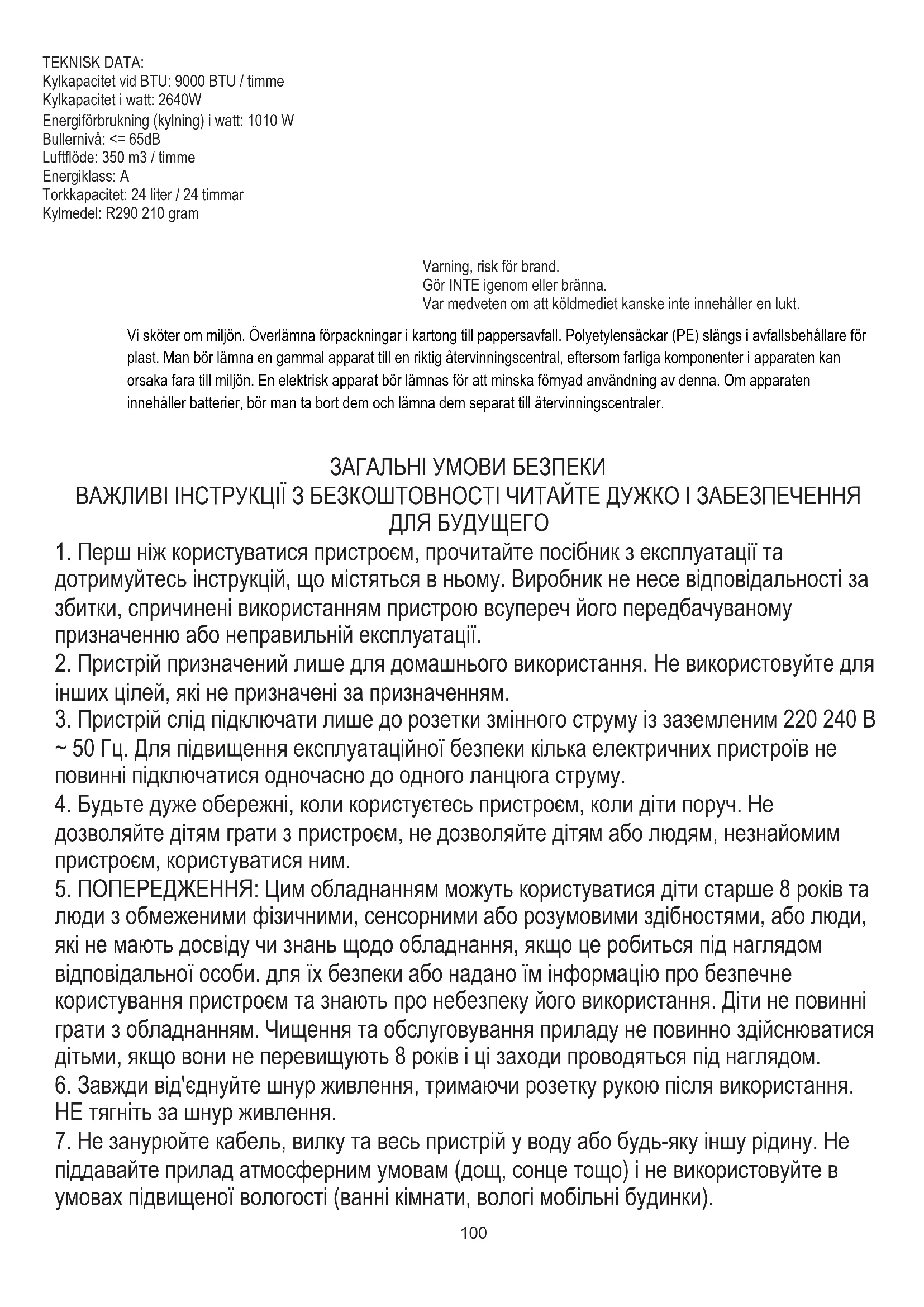 Не ремонтуйте пристрій самостійно. Не кваліфікований ремонт позбавить гарантії. ТЕХНІЧНІ ДАНІ: Потужність охолодження в БТУ: 9000 БТУ / годину Потужність охолодження у ватах: 2640 Вт Споживання енергії (охолодження) у ватах: 1010 Вт Рівень шуму: <= 65 дБ Потік повітря: 350 м3 / годину Енергетичний клас: A Ємність сушіння: 24 літри / 24 години Охолоджуючий засіб: R290 210 грам Обережність, небезпека пожежі. НЕ проколюйте та не горіть. Майте на увазі, що холодоагент може не містити запаху. У інтересах навколишнього середовища. Будь ласка, віддайте картонну упаковку в місце збору мукулатури. Політиленові мішки (PE) викинути в смітник для пластику. Відпрацьований пристрій повинен бути відправлений у відповідну точку зберігання, тому що в пристрої є небезпечні інгредієнти, які можуть становити загрозу навколишньому середовищу. Електричний пристрій потрібно повернути так, щоб обмежити його повторне використання. Якщо у пристрої є батерейки, то потрібно їх витягнути і віддати до відповідного пунтку.105