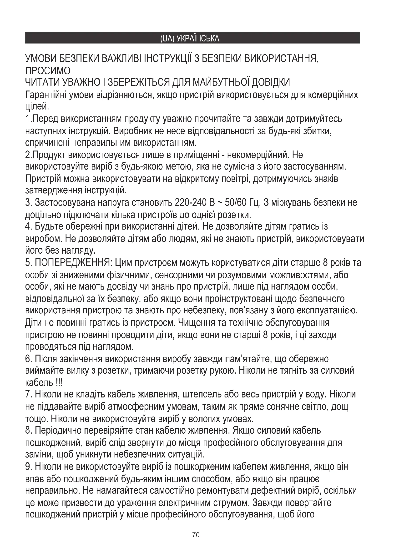 не піддавайте виріб атмосферним умовам, таким як пряме сонячне світло, дощ тощо. Ніколи не використовуйте виріб у вологих умовах. 2.Продукт використовується лише в приміщенні - некомерційний. Не використовуйте виріб з будь-якою метою, яка не сумісна з його застосуванням. Пристрій можна використовувати на відкритому повітрі, дотримуючись знаків затвердження інструкцій. УМОВИ БЕЗПЕКИ ВАЖЛИВІ ІНСТРУКЦІЇ З БЕЗПЕКИ ВИКОРИСТАННЯ,