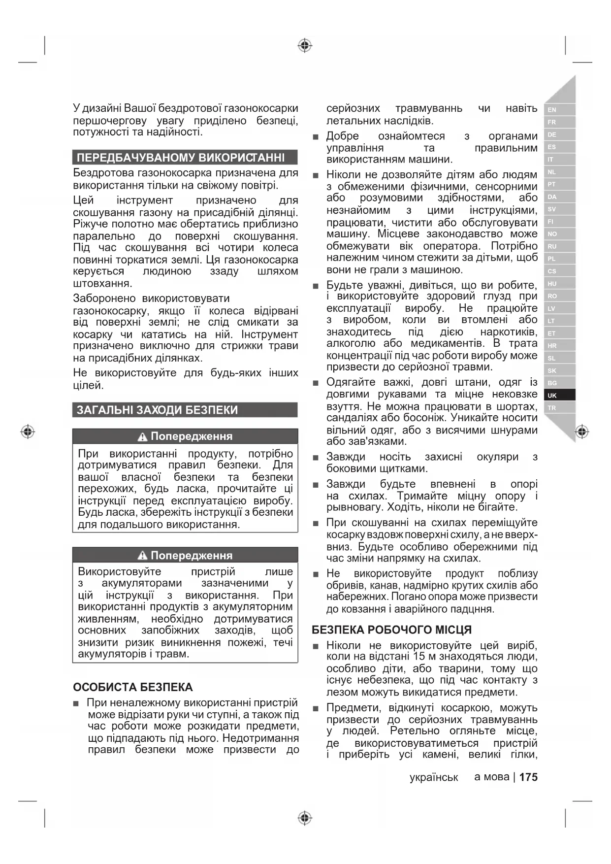 Предупреждение 174 | Бълг арияУ дизайні Вашої бездротової газонокосарки першочергову увагу приділено безпеці, потужності та надійності. ПЕРЕДБАЧУВАНОМУ ВИКОРИС