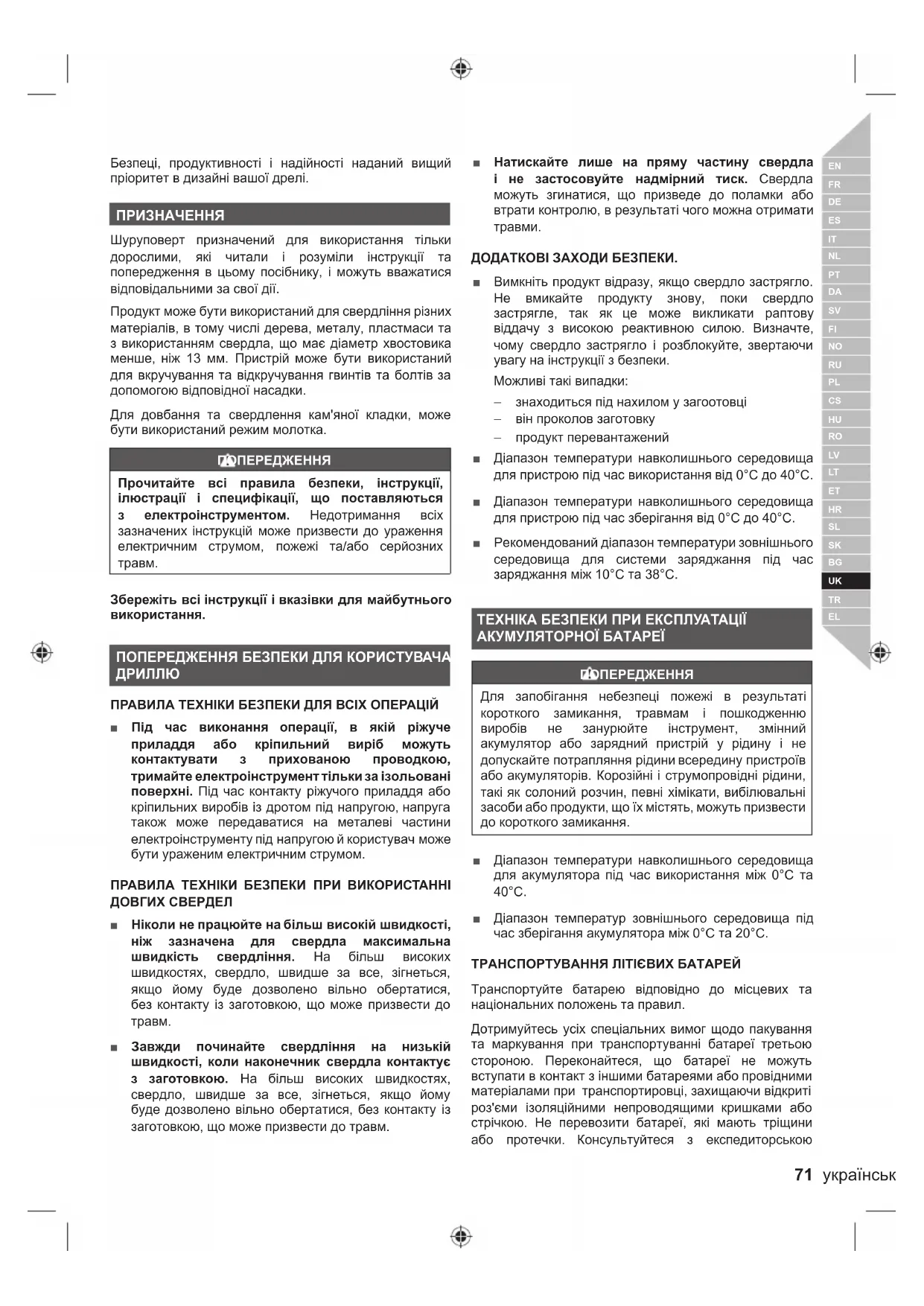 ДОДАТКОВІ ЗАХОДИ БЕЗПЕКИ. ■ Вимкніть продукт відразу, якщо свердло застрягло. Не вмикайте продукту знову, поки свердло застрягле, так як це може викликати раптову віддачу з високою реактивною силою. Визначте, чому свердло застрягло і розблокуйте, звертаючи увагу на інструкції з безпеки. Можливі такі випадки: – знаходиться під нахилом у загоотовці – він проколов заготовку – продукт перевантажений ■ Діапазон температури навколишнього середовища для пристрою під час використання від 0°C до 40°C. ■ Діапазон температури навколишнього середовища для пристрою під час зберігання від 0°C до 40°C. ■ Рекомендований діапазон температури зовнішнього середовища для системи заряджання під час заряджання між 10°C та 38°C. ТЕХНІКА БЕЗПЕКИ ПРИ ЕКСПЛУАТАЦІЇ АКУМУЛЯТОРНОЇ БАТАРЕЇ ПОПЕРЕДЖЕННЯ Для запобігання небезпеці пожежі в результаті короткого замикання, травмам і пошкодженню виробів не занурюйте інструмент, змінний акумулятор або зарядний пристрій у рідину і не допускайте потрапляння рідини всередину пристроїв або акумуляторів. Корозійні і струмопровідні рідини, такі як солоний розчин, певні хімікати, вибілювальні засоби або продукти, що їх містять, можуть призвести до короткого замикання. ■ Діапазон температури навколишнього середовища для акумулятора під час використання між 0°C та 40°C. ■ Діапазон температур зовнішнього середовища під час зберігання акумулятора між 0°C та 20°C. ТРАНСПОРТУВАННЯ ЛІТІЄВИХ БАТАРЕЙ Транспортуйте батарею відповідно до місцевих та національних положень та правил. Дотримуйтесь усіх спеціальних вимог щодо пакування та маркування при транспортуванні батареї третьою стороною. Переконайтеся, що батареї не можуть вступати в контакт з іншими батареями або провідними матеріалами при транспортировці, захищаючи відкриті роз'єми ізоляційними непроводящими кришками або стрічкою. Не перевозити батареї, які мають тріщини або протечки. Консультуйтеся з експедиторською72 | українська мова компанією для подальших консультацій. ЗАЛИШКОВІ РИЗИКИ Навіть коли продукт використовується як написано, залишається неможливим повністю усунути деякі залишкові чинники ризику. Наступні небезпеки можуть виникнути і оператор повинен звернути особливу увагу, щоб уникнути наступного: ■ Пошкодження слуху, викликане шумом – Надягайте засоби захисту для органів слуху та лімітуйте вплив. ■ Травмування очей – Носіть захисні окуляри або окулярні щити при використанні продукту. ■ Травми, викликані вібрацією – Лімітуйте вплив. Дотримуйтесь інструкцій, зазначених у розділі "Зменшення ризику". ■ Ураження електричним струмом через контакт із прихованими проводами – Тримайте продукт тільки за ізольовані поверхні. ■ Травми, викликані пилом. – Пил, який створюється при використанні виробу, може призвести до травми дихальних шляхів. Надягайте відповідну пилозахисну маску з фільтром, придатним для затримання часток матеріалу, що оброблюється. ЗНИЖЕННЯ РИЗИКУ Повідомлялося, що вібрації від ручних інструментів у певних осіб можуть сприяти стану, який називається синдромом Рейно. Симптоми можуть включати поколювання, оніміння і збліднення пальців, як правило, очевидні при впливі холоду. Спадкові фактори, вплив холоду і вогкості, дієта, куріння і робоча практика, всі ці чинники роблять свій внесок у розвиток цих симптомів. Ці заход