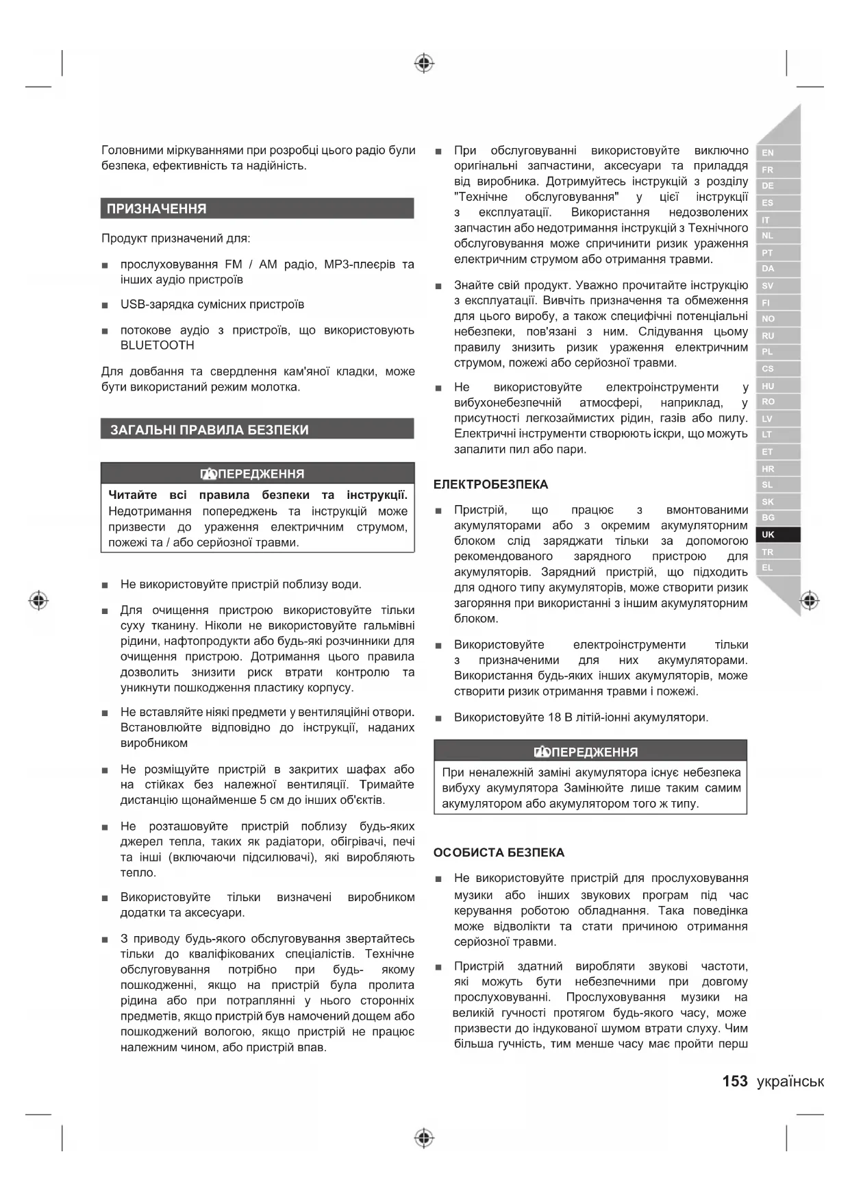 Головними міркуваннями при розробці цього радіо були безпека, ефективність та надійність. ПРИЗНАЧЕННЯ Продукт призначений для: ■ прослуховування FM / AM радіо, MP3-плеєрів та інших аудіо пристроїв ■ USB-зарядка сумісних пристроїв ■ потокове аудіо з пристроїв, що використовують BLUETOOTH Для довбання та свердлення кам'яної кладки, може бути використаний режим молотка. ЗАГАЛЬНІ ПРАВИЛА БЕЗПЕКИ ПОПЕРЕДЖЕННЯ Читайте всі правила безпеки та інструкції. Недотримання попереджень та інструкцій може призвести до ураження електричним струмом, пожежі та / або серйозної травми. ■ Не використовуйте пристрій поблизу води. ■ Для очищення пристрою використовуйте тільки суху тканину. Ніколи не використовуйте гальмівні рідини, нафтопродукти або будь-які розчинники для очищення пристрою. Дотримання цього правила дозволить знизити риск втрати контролю та уникнути пошкодження пластику корпусу. ■ Не вставляйте ніякі предмети у вентиляційні отвори. Встановлюйте відповідно до інструкції, наданих