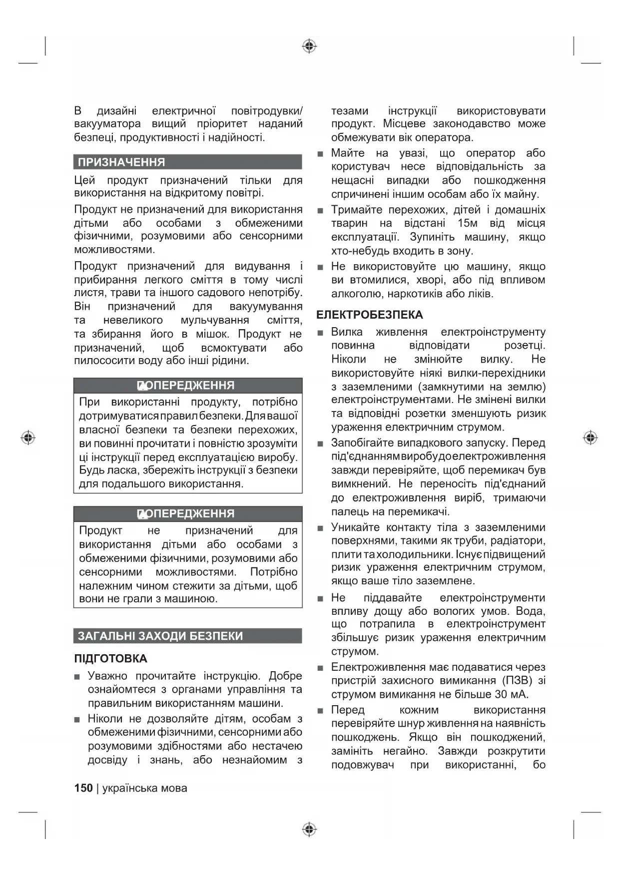 Без предупредителен символ за безопасност Указва ситуация, която може да доведе до имуществени щети.150 | українська мова В дизайні електричної повітродувки/ вакууматора вищий пріоритет наданий безпеці, продуктивності і надійності. ПРИЗНАЧЕННЯ Цей продукт призначений тільки для використання на відкритому повітрі. Продукт не призначений для використання дітьми або особами з обмеженими фізичними, розумовими або сенсорними можливостями. Продукт призначений для видування і прибирання легкого сміття в тому числі листя, трави та іншого садового непотрібу. Він призначений для вакуумування та невеликого мульчування сміття, та збирання його в мішок. Продукт не призначений, щоб всмоктувати або пилососити воду або інші рідини. ПОПЕРЕДЖЕННЯ При використанні продукту, потрібно дотримуватися правил безпеки. Для вашої власної безпеки та безпеки перехожих, ви повинні прочитати і повністю зрозуміти ці інструкції перед експлуатацією виробу. Будь ласка, збережіть інструкції з безпеки для подальшого використання. ПОПЕРЕДЖЕННЯ Продукт не призначений для використання дітьми або особами з обмеженими фізичними, розумовими або сенсорними можливостями. Потрібно належним чином стежити за дітьми, щоб вони не грали з машиною. ЗАГАЛЬНІ ЗАХОДИ БЕЗПЕКИ