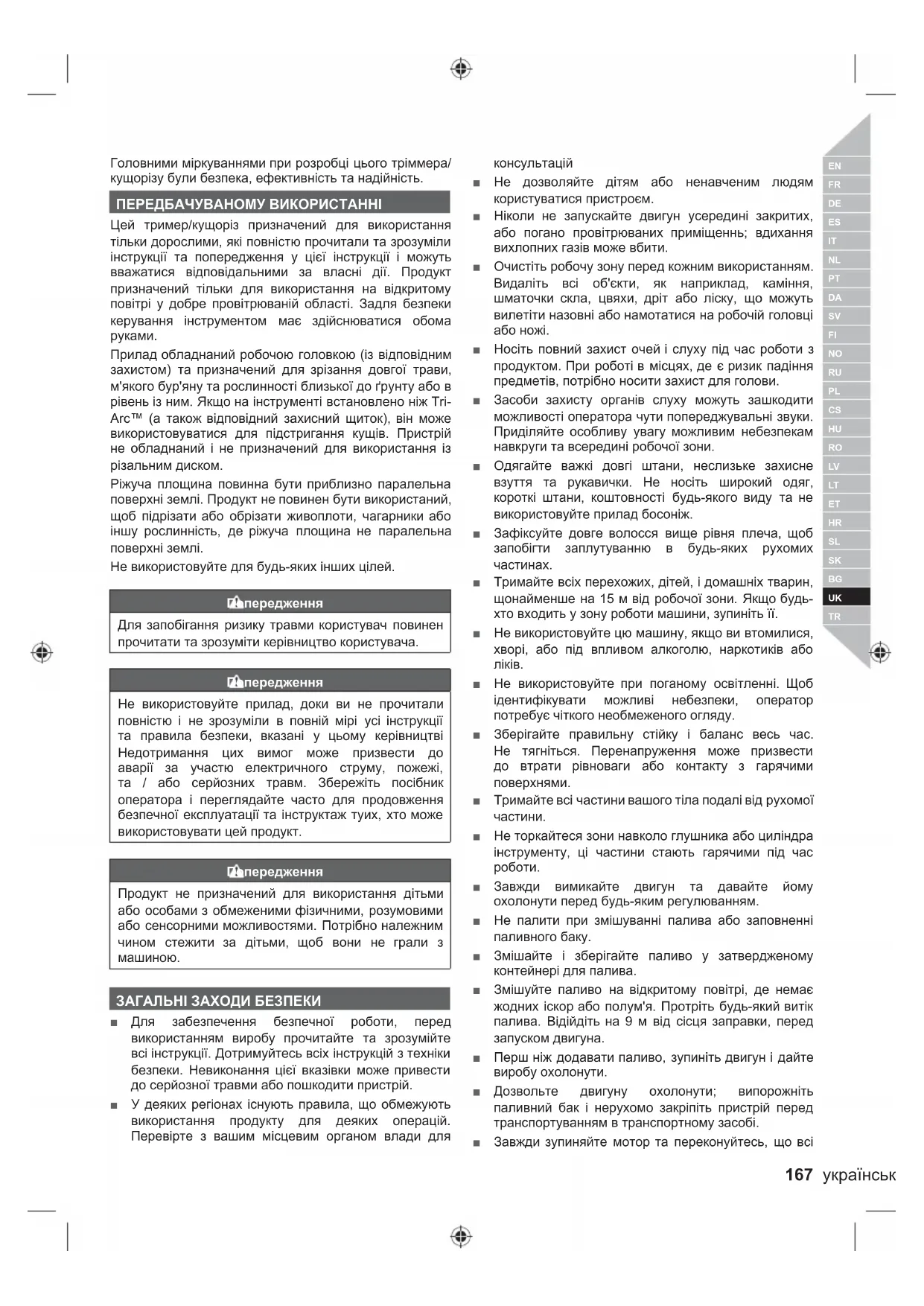 Головними міркуваннями при розробці цього тріммера/ кущорізу були безпека, ефективність та надійність. ПЕРЕДБАЧУВАНОМУ ВИКОРИСТАННІ Цей тример/кущоріз призначений для використання тільки дорослими, які повністю прочитали та зрозуміли інструкції та попередження у цієї інструкції і можуть вважатися відповідальними за власні дії. Продукт призначений тільки для використання на відкритому повітрі у добре провітрюваній області. Задля безпеки керування інструментом має здійснюватися обома