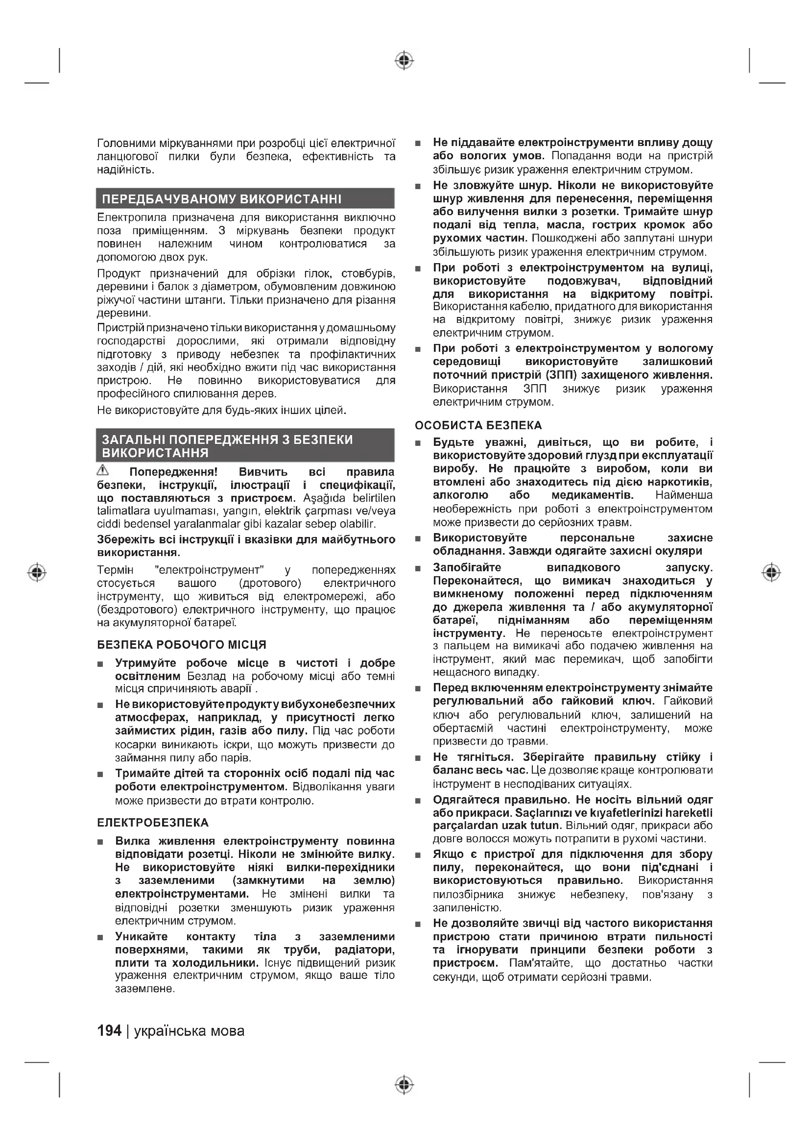Пристрій призначено тільки використання у домашньому господарстві дорослими, які отримали відповідну підготовку з приводу небезпек та профілактичних заходів / дій, які необхідно вжити під час використання пристрою. Не повинно використовуватися для професійного спилювання дерев. Не використовуйте для будь-яких інших цілей. ЗАГАЛЬНІ ПОПЕРЕДЖЕННЯ З БЕЗПЕКИ ВИКОРИСТАННЯ Попередження! Вивчить всі правила безпеки, інструкції, ілюстрації і специфікації, що поставляються з пристроєм. Aşağıda belirtilen talimatlara uyulmaması, yangın, elektrik çarpması ve/veya ciddi bedensel yaralanmalar gibi kazalar sebep olabilir. Збережіть всі інструкції і вказівки для майбутнього використання. Термін "електроінструмент" у попередженнях стосується вашого (дротового) електричного інструменту, що живиться від електромережі, або (бездротового) електричного інструменту, що працює на акумуляторної батареї