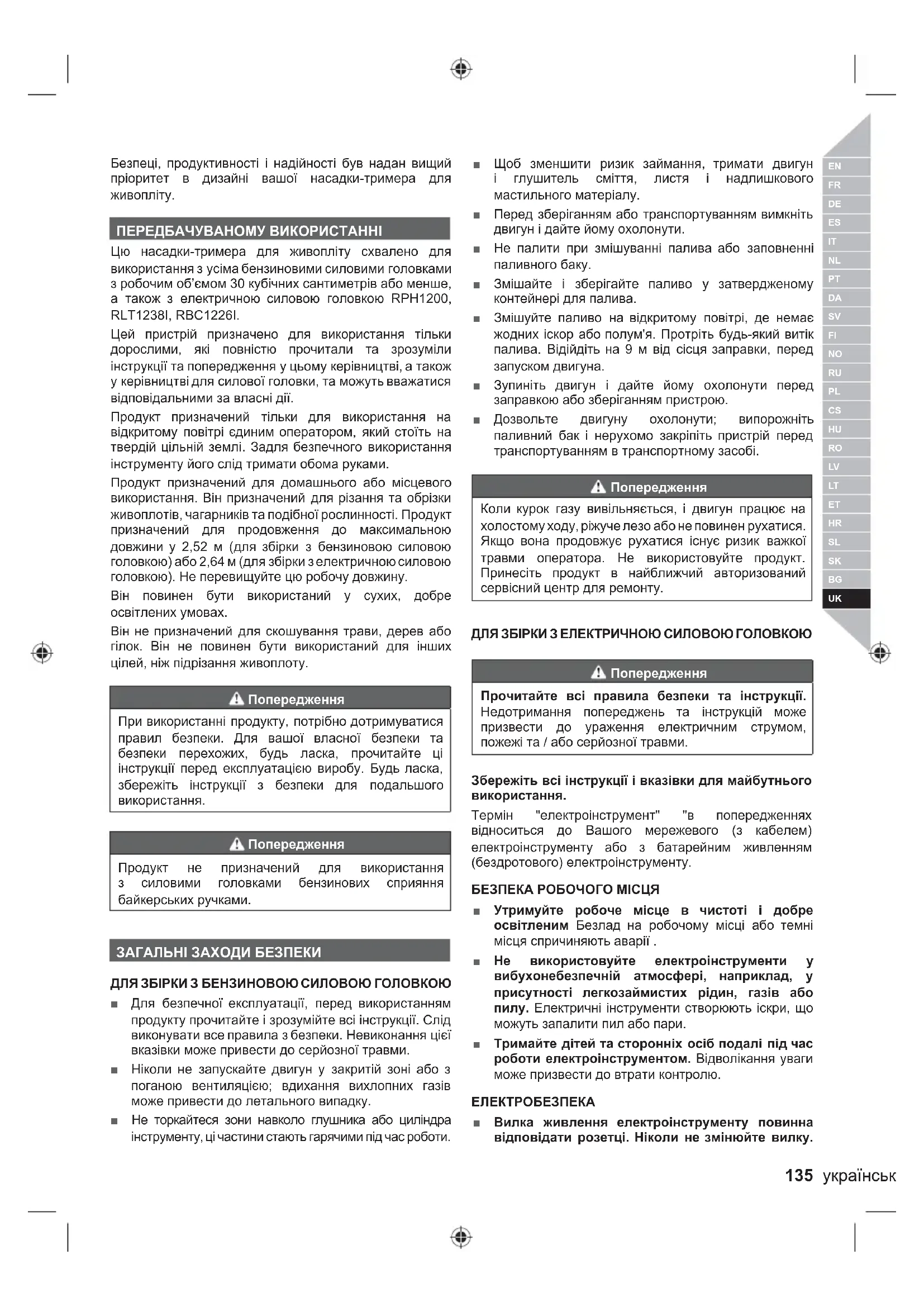 ПЕРЕДБАЧУВАНОМУ ВИКОРИСТАННІ Цю насадки-тримера для живопліту схвалено для використання з усіма бензиновими силовими головками з робочим об’ємом 30 кубічних сантиметрів або менше, а також з електричною силовою головкою RPH1200, RLT1238I, RBC1226I. Цей пристрій призначено для використання тільки дорослими, які повністю прочитали та зрозуміли інструкції та попередження у цьому керівництві, а також у керівництві для силової головки, та можуть вважатися відповідальними за власні дії. Продукт призначений тільки для використання на відкритому повітрі єдиним оператором, який стоїть на твердій цільній землі. Задля безпечного використання інструменту його слід тримати обома руками. Продукт призначений для домашнього або місцевого використання. Він призначений для різання та обрізки живоплотів, чагарників та подібної рослинності. Продукт призначений для продовження до максимальною довжини у 2,52 м (для збірки з бензиновою силовою головкою) або 2,64 м (для збірки з електричною силовою головкою). Не перевищуйте цю робочу довжину. Він повинен бути використаний у сухих, добре освітлених умовах. Він не призначений для скошування трави, дерев або гілок. Він не повинен бути використаний для інших цілей, ніж підрізання живоплоту. Попередження При використанні продукту, потрібно дотримуватися правил безпеки. Для вашої власної безпеки та безпеки перехожих, будь ласка, прочитайте ці інструкції перед експлуатацією виробу. Будь ласка, збережіть інструкції з безпеки для подальшого використання. Попередження Продукт не призначений для використання з силовими головками бензинових сприяння байкерських ручками. ЗАГАЛЬНІ ЗАХОДИ БЕЗПЕКИ ДЛЯ ЗБІРКИ З БЕНЗИНОВОЮ СИЛОВОЮ ГОЛОВКОЮ ■ Для безпечної експлуатації, перед використанням продукту прочитайте і зрозумійте всі інструкції. Слід виконувати все правила з безпеки. Невиконання цієї вказівки може привести до серйозної травми. ■ Ніколи не запускайте двигун у закритій зоні або з поганою вентиляцією; вдихання вихлопних газів може привести до летального випадку. ■ Не торкайтеся зони навколо глушника або циліндра інструменту, ці частини стають гарячими під час роботи. ■ Щоб зменшити ризик займання, тримати двигун і глушитель сміття, листя і надлишкового мастильного матеріалу. ■ Перед зберіганням або транспортуванням вимкніть двигун і дайте йому охолонути. ■ Не палити при змішуванні палива або заповненні паливного баку. ■ Змішайте і зберігайте паливо у затвердженому контейнері для палива. ■ Змішуйте паливо на відкритому повітрі, де немає жодних іскор або полум'я. Протріть будь-який витік палива. Відійдіть на 9 м від сісця заправки, перед запуском двигуна. ■ Зупиніть двигун і дайте йому охолонути перед заправкою або зберіганням пристрою. ■ Дозвольте двигуну охолонути; випорожніть паливний бак і нерухомо закріпіть пристрій перед транспортуванням в транспортному засобі. Попередження Коли курок газу вивільняється, і двигун працює на холостому ходу, ріжуче лезо або не повинен рухатися. Якщо вона продовжує рухатися існує ризик важкої травми оператора. Не використовуйте продукт. Принесіть продукт в найближчий авторизований сервісний центр для ремонту. ДЛЯ ЗБІРКИ З ЕЛЕКТРИЧНОЮ СИЛОВОЮ ГОЛОВКОЮ Попередження Прочитайте всі правила безпеки та інструкції. Недотримання попереджень та інструкцій може призве
