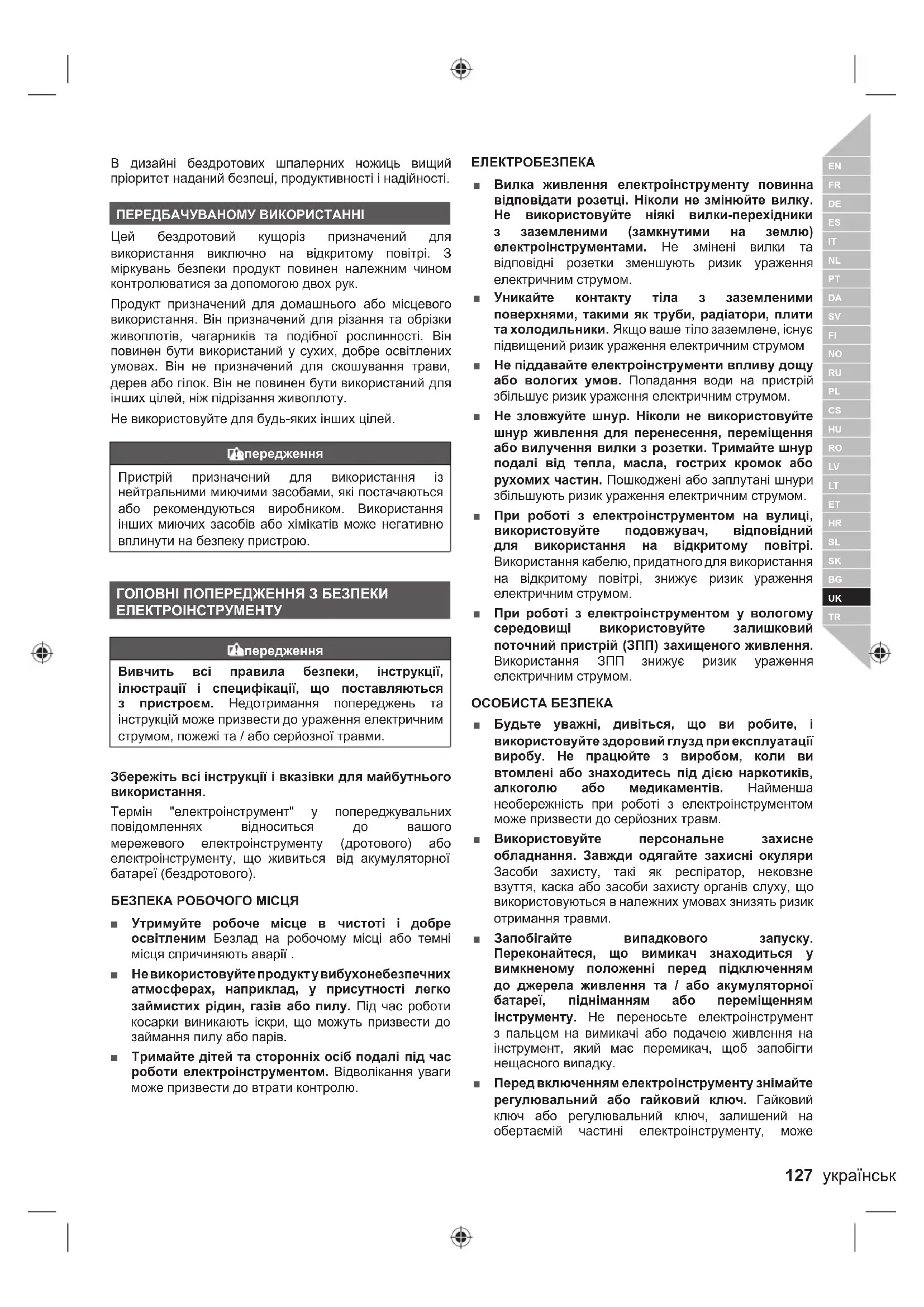 В дизайні бездротових шпалерних ножиць вищий пріоритет наданий безпеці, продуктивності і надійності. ПЕРЕДБАЧУВАНОМУ ВИКОРИСТАННІ Цей бездротовий кущоріз призначений для використання виключно на відкритому повітрі. З міркувань безпеки продукт повинен належним чином контролюватися за допомогою двох рук. Продукт призначений для домашнього або місцевого використання. Він призначений для різання та обрізки живоплотів, чагарників та подібної рослинності. Він повинен бути використаний у сухих, добре освітлених умовах. Він не призначений для скошування трави, дерев або гілок. Він не повинен бути використаний для інших цілей, ніж підрізання живоплоту. Не використовуйте для будь-яких інших цілей. Попередження Пристрій призначений для використання із нейтральними миючими засобами, які постачаються або рекомендуються виробником. Використання інших миючих засобів або хімікатів може негативно вплинути на безпеку пристрою. ГОЛОВНІ ПОПЕРЕДЖЕННЯ З БЕЗПЕКИ ЕЛЕКТРОІНСТРУМЕНТУ Попередження Вивчить всі правила безпеки, інструкції, ілюстрації і специфікації, що поставляються з пристроєм. Недотримання попереджень та інструкцій може призвести до ураження електричним струмом, пожежі та / або серйозної травми. Збережіть всі інструкції і вказівки для майбутнього використання. Термін "електроінструмент" у попереджувальних повідомленнях відноситься до вашого мережевого електроінструменту (дротового) або електроінструменту, що живиться від акумуляторної батареї (бездротового). БЕЗПЕКА РОБОЧОГО МІСЦЯ ■ Утримуйте робоче місце в чистоті і добре освітленим Безлад на робочому місці або темні місця спричиняють аварії . ■ Не використовуйте продукт у вибухонебезпечних атмосферах, наприклад, у присутності легко займистих рідин, газів або пилу. Під час роботи косарки виникають іскри, що можуть призвести до займання пилу або парів. ■ Тримайте дітей та сторонніх осіб подалі під час роботи електроінструментом. Відволікання уваги може призвести до втрати контролю. ЕЛЕКТРОБЕЗПЕКА ■ Вилка живлення електроінструменту повинна відповідати розетці. Ніколи не змінюйте вилку. Не використовуйте ніякі вилки-перехідники з заземленими (замкнутими на землю) електроінструментами. Не змінені вилки та відповідні розетки зменшують ризик ураження електричним струмом. ■ Уникайте контакту тіла з заземленими поверхнями, такими як труби, радіатори, плити та холодильники. Якщо ваше тіло заземлене, існує підвищений ризик ураження електричним струмом ■ Не піддавайте електроінструменти впливу дощу або вологих умов. Попадання води на пристрій збільшує ризик ураження електричним струмом. ■ Не зловжуйте шнур. Ніколи не використовуйте шнур живлення для перенесення, переміщення або вилучення вилки з розетки. Тримайте шнур подалі від тепла, масла, гострих кромок або рухомих частин. Пошкоджені або заплутані шнури збільшують ризик ураження електричним струмом. ■ При роботі з електроінструментом на вулиці, використовуйте подовжувач, відповідний для використання на відкритому повітрі. Використання кабелю, придатного для використання на відкритому повітрі, знижує ризик ураження електричним струмом. ■ При роботі з електроінструментом у вологому середовищі використовуйте залишковий поточний пристрій (ЗПП) захищеного живлення. Використання ЗПП знижує ризик 