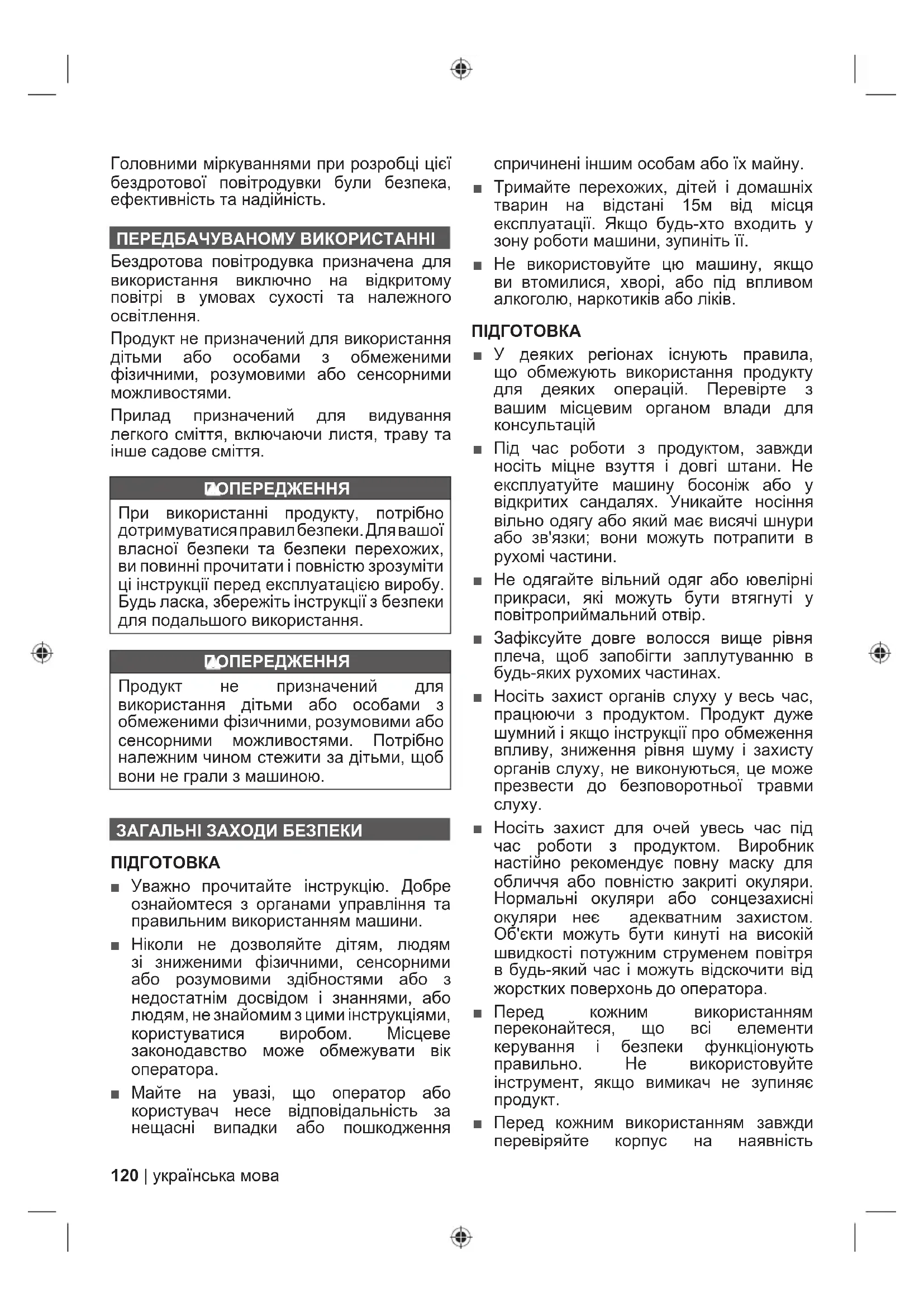 Без предупредителен символ за безопасност Указва ситуация, която може да доведе до имуществени щети.120 | українська мова Головними міркуваннями при розробці цієї бездротової повітродувки були безпека, ефективність та надійність. ПЕРЕДБАЧУВАНОМУ ВИКОРИСТАННІ Бездротова повітродувка призначена для використання виключно на відкритому повітрі в умовах сухості та належного освітлення. Продукт не призначений для використання дітьми або особами з обмеженими фізичними, розумовими або сенсорними можливостями. Прилад призначений для видування легкого сміття, включаючи листя, траву та інше садове сміття. ПОПЕРЕДЖЕННЯ При використанні продукту, потрібно дотримуватися правил безпеки. Для вашої власної безпеки та безпеки перехожих, ви повинні прочитати і повністю зрозуміти ці інструкції перед експлуатацією виробу. Будь ласка, збережіть інструкції з безпеки для подальшого використання. ПОПЕРЕДЖЕННЯ Продукт не призначений для використання дітьми або особами з обмеженими фізичними, розумовими або сенсорними можливостями. Потрібно належним чином стежити за дітьми, щоб вони не грали з машиною. ЗАГАЛЬНІ ЗАХОДИ БЕЗПЕКИ