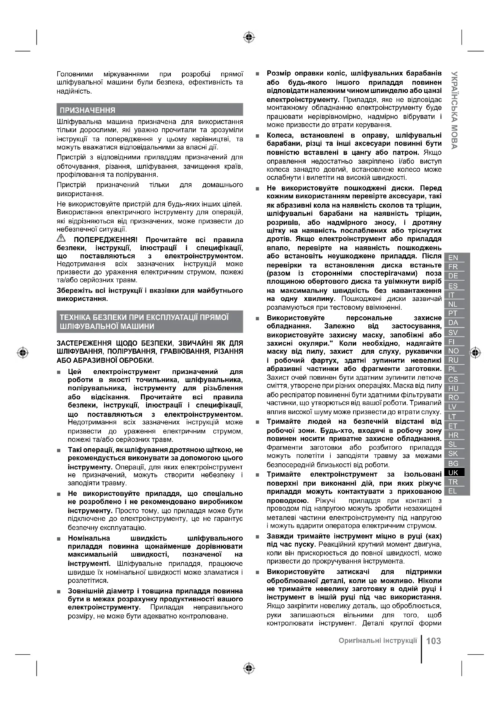 Превод от оригиналните инструкцииГоловними міркуваннями при розробці прямої шліфувальної машини були безпека, ефективність та надійність. ПРИЗНАЧЕННЯ Шліфувальна машина призначена для використання тільки дорослими, які уважно прочитали та зрозуміли інструкції та попередження у цьому керівництві, та можуть вважатися відповідальними за власні дії. Пристрій з відповідними приладдям призначений для обточування, різання, шліфування, зачищення країв, профілювання та полірування. Пристрій призначений тільки для домашнього використання. Не використовуйте пристрій для будь-яких інших цілей. Використання електричного інструменту для операцій, які відрізняються від призначених, може призвести до небезпечної ситуації. ПОПЕРЕДЖЕННЯ! Прочитайте всі правила безпеки, інструкції, ілюстрації і специфікації, що поставляються з електроінструментом. Недотримання всіх зазначених інструкцій може призвести до ураження електричним струмом, пожежі та/або серйозних травм. Збережіть всі інструкції і вказівки для майбутнього використання. ТЕХНІКА БЕЗПЕКИ ПРИ ЕКСПЛУАТАЦІЇ ПРЯМОЇ ШЛІФУВАЛЬНОЇ МАШИНИ ЗАСТЕРЕЖЕННЯ ЩОДО БЕЗПЕКИ, ЗВИЧАЙНІ ЯК ДЛЯ ШЛІФУВАННЯ, ПОЛІРУВАННЯ, ГРАВІЮВАННЯ, РІЗАННЯ АБО АБРАЗИВНОЇ ОБРОБКИ. ■ Цей електроінструмент призначений для роботи в якості точильника, шліфувальника, полірувальника, інструменту для різьблення або відсікання. Прочитайте всі правила безпеки, інструкції, ілюстрації і специфікації, що поставляються з електроінструментом. Недотримання всіх зазначених інструкцій може призвести до ураження електричним струмом, пожежі та/або серйозних травм. ■ Такі операції, як шліфування дротяною щіткою, не рекомендується виконувати за допомогою цього інструменту. Операції, для яких електроінструмент не призначений, можуть створити небезпеку і заподіяти травму. ■ Не використовуйте приладдя, що спеціально не розроблено і не рекомендовано виробником інструменту. Просто тому, що приладдя може бути підключене до електроінструменту, це не гарантує безпечну експлуатацію. ■ Номінальна швидкість шліфувального приладдя повинна щонайменше дорівнювати максимальній швидкості, позначеної на інструменті. Шліфувальне приладдя, працююче швидше їх номінальної швидкості може зламатися і розлетітися. ■ Зовнішній діаметр і товщина приладдя повинна бути в межах розрахунку продуктивності вашого електроінструменту. Приладдя неправильного розміру, не може бути адекватно контролюване. ■ Розмір оправки коліс, шліфувальних барабанів або будь-якого іншого приладдя повинен відповідати належним чином шпинделю або цанзі електроінструменту. Приладдя, яке не відповідає монтажному обладнанню електроінструменту буде працювати неріврівномірно, надмірно вібрувати і може призвести до втрати керування. ■ Колеса, встановлені в оправу, шліфувальні барабани, різці та інші аксесуари повинні бути повністю вставлені в цангу або патрон. Якщо оправлення недостатньо закріплено і/або виступ колеса занадто довгий, встановлене колесо може ослабнути і вилетіти на високій швидкості. ■ Не використовуйте пошкоджені диски. Перед кожним використанням перевірте аксесуари, такі як абразивні кола на наявність сколов та тріщин, шліфувальні барабани на наявність тріщин, розривів, або надмірного зносу, і дротяну щітку на наявність послаблених 