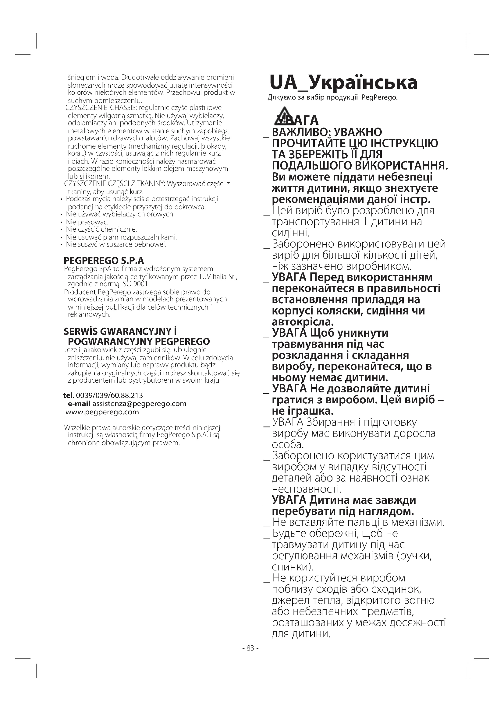 7 УВАГА! ЗАБОРОНЕНО використовувати передній бампер як ручку для піднімання коляски, коли в ній перебуває дитина (мал. c).- 87 - УВАГА! Заборонено піднімати коляску за капюшон, коли в ній перебуває дитина (мал. d). АКСЕСУАРЫ (ПРОДАЮТЬСЯ ОКРЕМО) Аксесуари PegPerego розроблені як корисний, практичний засіб для спрощення життя батьків. Відкрийте для себе всі аксесуари вашого продукту. Запитуйте у продавця. ЧИЩЕННЯ ТА ДОГЛЯД Чищення виробу мають виконувати тільки дорослі особи. ОБСЛУГОВУВАННЯ ПРОДУКТУ: захищати від негоди: води, дощу або снігу; тривалий і безперервний вплив яскравого сонячного світла може призвести до зміни кольору різних матеріалів; зберігати цей продукт в сухому місці. ЧИЩЕННЯ CHASSIS: час від часу чистити всі пласмасові деталі вологою тканиною. Не використовувати розчинники або аналогічні продукти чищення; тримати всі металеві частини сухими для запобігання корозії; тримати рухомі частини в чистоті (механізми регулювання, механізми блокування, колеса...) і вільними від пилу і піску; змащувати світлим машинним мастилом в разі необхідності. Під час прання уважно дотримуйтеся інструкцій, зазначених на етикетці, яку пришито до оббивки. • Не використовувати хлорний відбілювач. • Не прасувати. • Не застосовувати хімічну чистку. • Не видаляти плями розчинниками. • Не сушити в сушильній машині.
