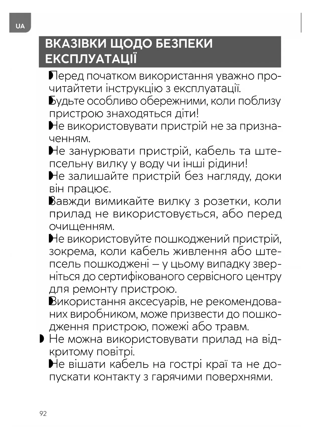 Не занурювати пристрій, кабель та ште- псельну вилку у воду чи інші рідини!