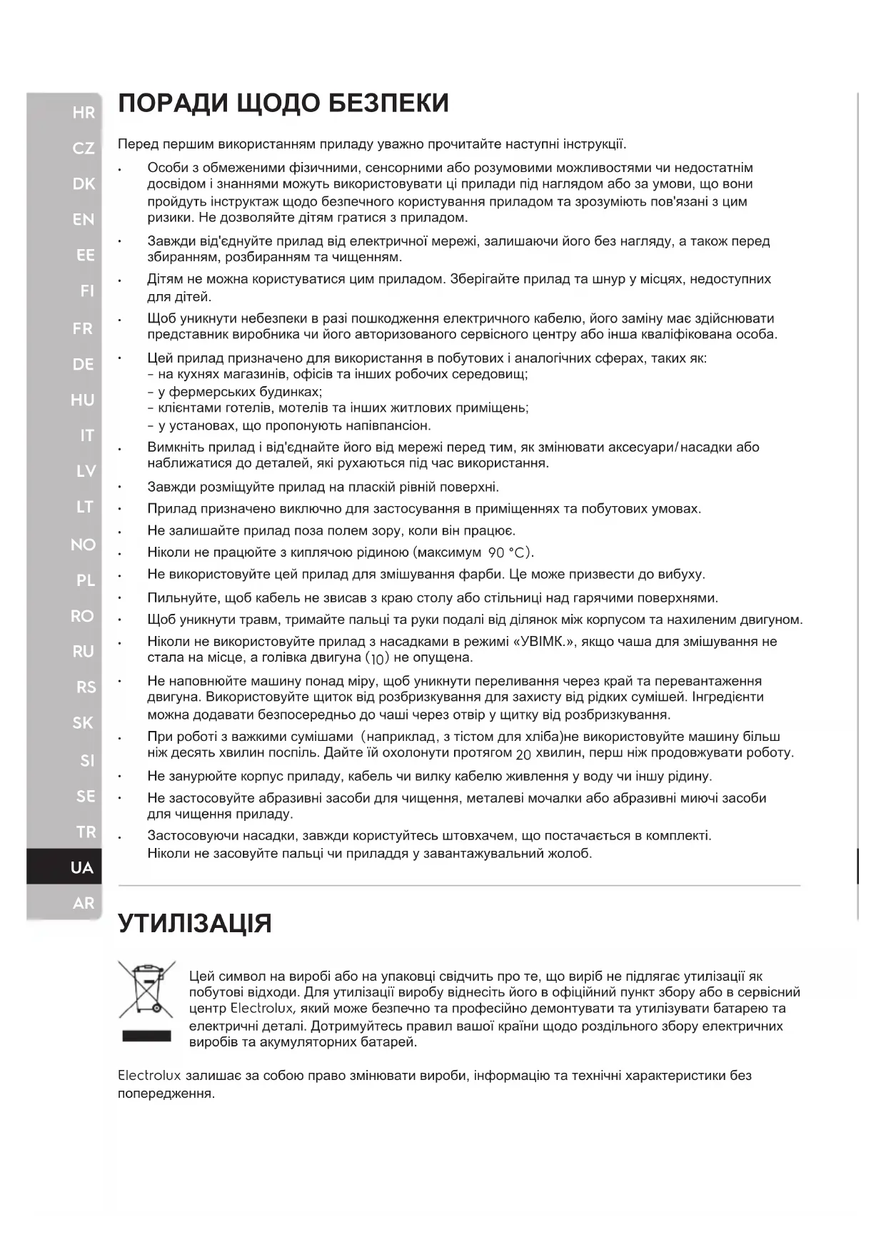 Цей символ на виробі або на упаковці свідчить про те, що виріб не підлягає утилізації як побутові відходи. Для утилізації виробу віднесіть його в офіційний пункт збору або в сервісний центр Electrolux, який може безпечно та професійно демонтувати та утилізувати батарею та електричні деталі. Дотримуйтесь правил вашої країни щодо роздільного збору електричних виробів та акумуляторних батарей. Electrolux залишає за собою право змінювати вироби, інформацію та технічні характеристики без попередження. Перед першим використанням приладу уважно прочитайте наступні інструкції. Особи з обмеженими фізичними, сенсорними або розумовими можливостями чи недостатнім досвідом і знаннями можуть використовувати ці прилади під наглядом або за умови, що вони пройдуть інструктаж щодо безпечного користування приладом та зрозуміють пов'язані з цим ризики. Не дозволяйте дітям гратися з приладом. Завжди від'єднуйте прилад від електричної мережі, залишаючи його без нагляду, а також перед збиранням, розбиранням та чищенням. Дітям не можна користуватися цим приладом. Зберігайте прилад та шнур у місцях, недоступних