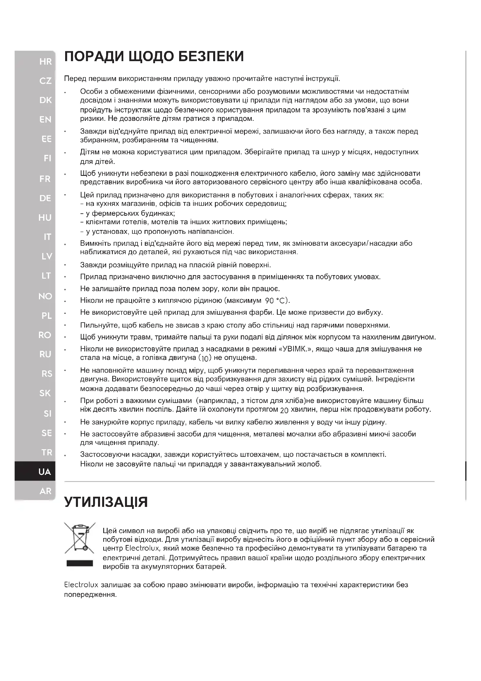 Цей символ на виробі або на упаковці свідчить про те, що виріб не підлягає утилізації як побутові відходи. Для утилізації виробу віднесіть його в офіційний пункт збору або в сервісний центр Electrolux, який може безпечно та професійно демонтувати та утилізувати батарею та електричні деталі. Дотримуйтесь правил вашої країни щодо роздільного збору електричних виробів та акумуляторних батарей. Electrolux залишає за собою право змінювати вироби, інформацію та технічні характеристики без попередження. Перед першим використанням приладу уважно прочитайте наступні інструкції. Особи з обмеженими фізичними, сенсорними або розумовими можливостями чи недостатнім досвідом і знаннями можуть використовувати ці прилади під наглядом або за умови, що вони пройдуть інструктаж щодо безпечного користування приладом та зрозуміють пов'язані з цим ризики. Не дозволяйте дітям гратися з приладом. Завжди від'єднуйте прилад від електричної мережі, залишаючи його без нагляду, а також перед збиранням, розбиранням та чищенням. Дітям не можна користуватися цим приладом. Зберігайте прилад та шнур у місцях, недоступних