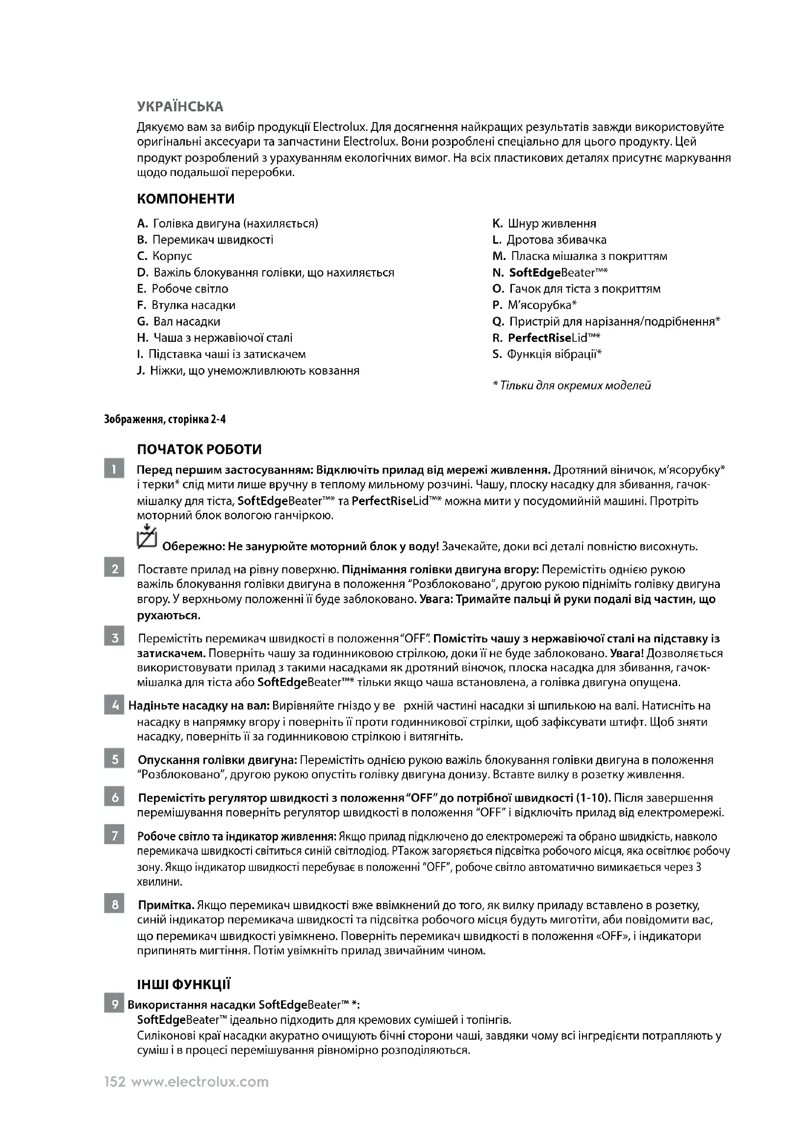 ЧИЩЕННЯ ТА ДОГЛЯД 22 Витягніть штекер з розетки. Дротяний віночок, м’ясорубку* та нарізувач/подрібнювач* рекомендується мити вручну в теплій м ильній воді. Чашу, плоску насадку, гачок-мішалку для тіста, SoftEdgeBeater™* та PerfectRiseLid™* можна мити у посудомийній машині. Протріть моторний блок вологою ганчіркою. Обережно: Не занурюйте моторний блок у воду! Зачекайте, доки всі деталі повністю висохнуть. 23 Не застосовуйте абразивні засоби та мочалки для чищення. Насолоджуйтесь вашим новим продуктом від Electrolux!154 www.electrolux.com ПОРАДИ ЩОДО ТЕХНІКИ БЕЗПЕКИ Уважно прочитайте ці інструкції перед першим використанням приладу.