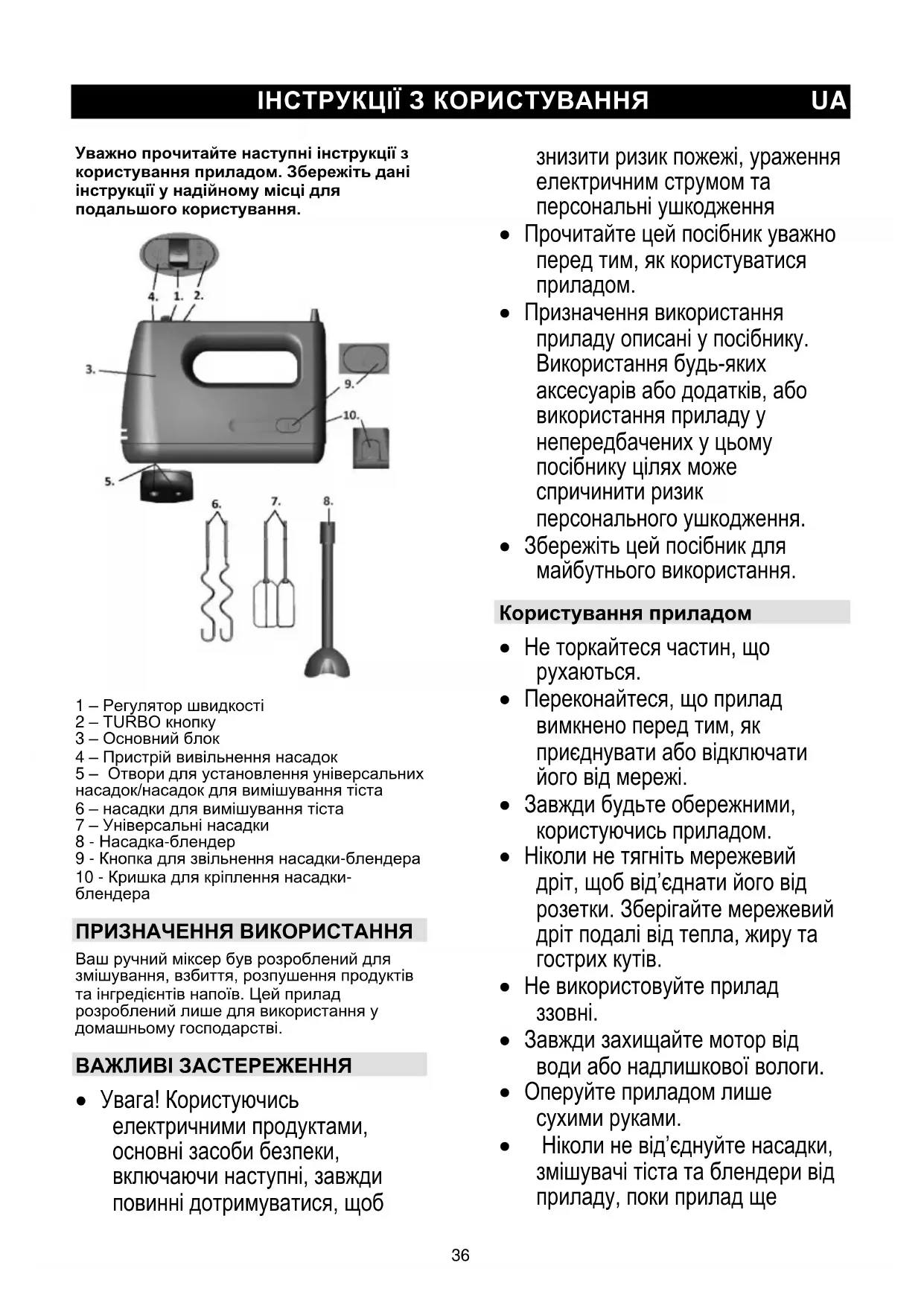ПРИЗНАЧЕННЯ ВИКОРИСТАННЯ Ваш ручний міксер був розроблений для змішування, взбиття, розпушення продуктів та інгредієнтів напоїв. Цей прилад розроблений лише для використання у домашньому господарстві. ВАЖЛИВІ ЗАСТЕРЕЖЕННЯ