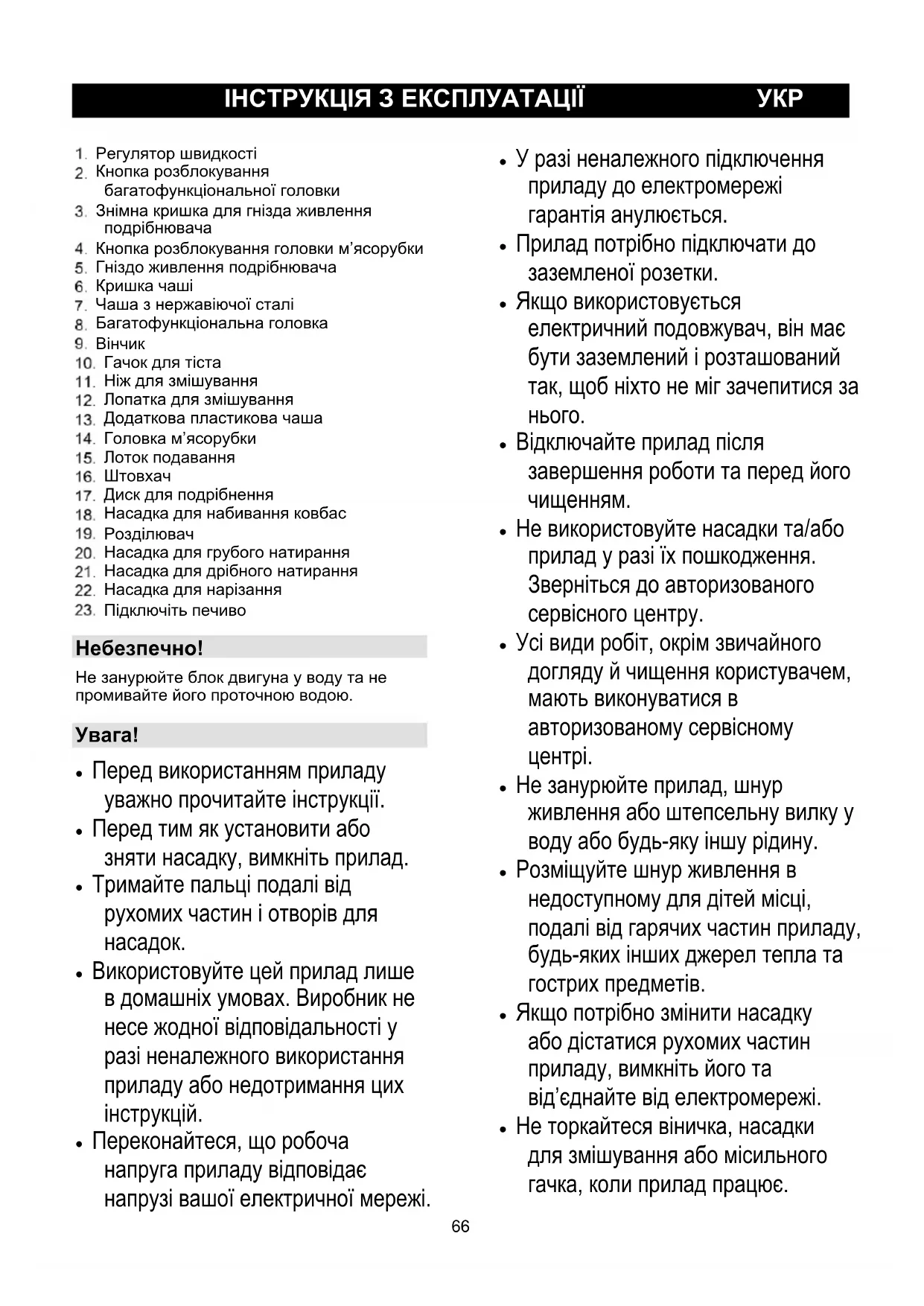 Насадка для грубого натирання Насадка для дрібного натирання Насадка для нарізання Підключіть печиво Небезпечно! Не занурюйте блок двигуна у воду та не промивайте його проточною водою.