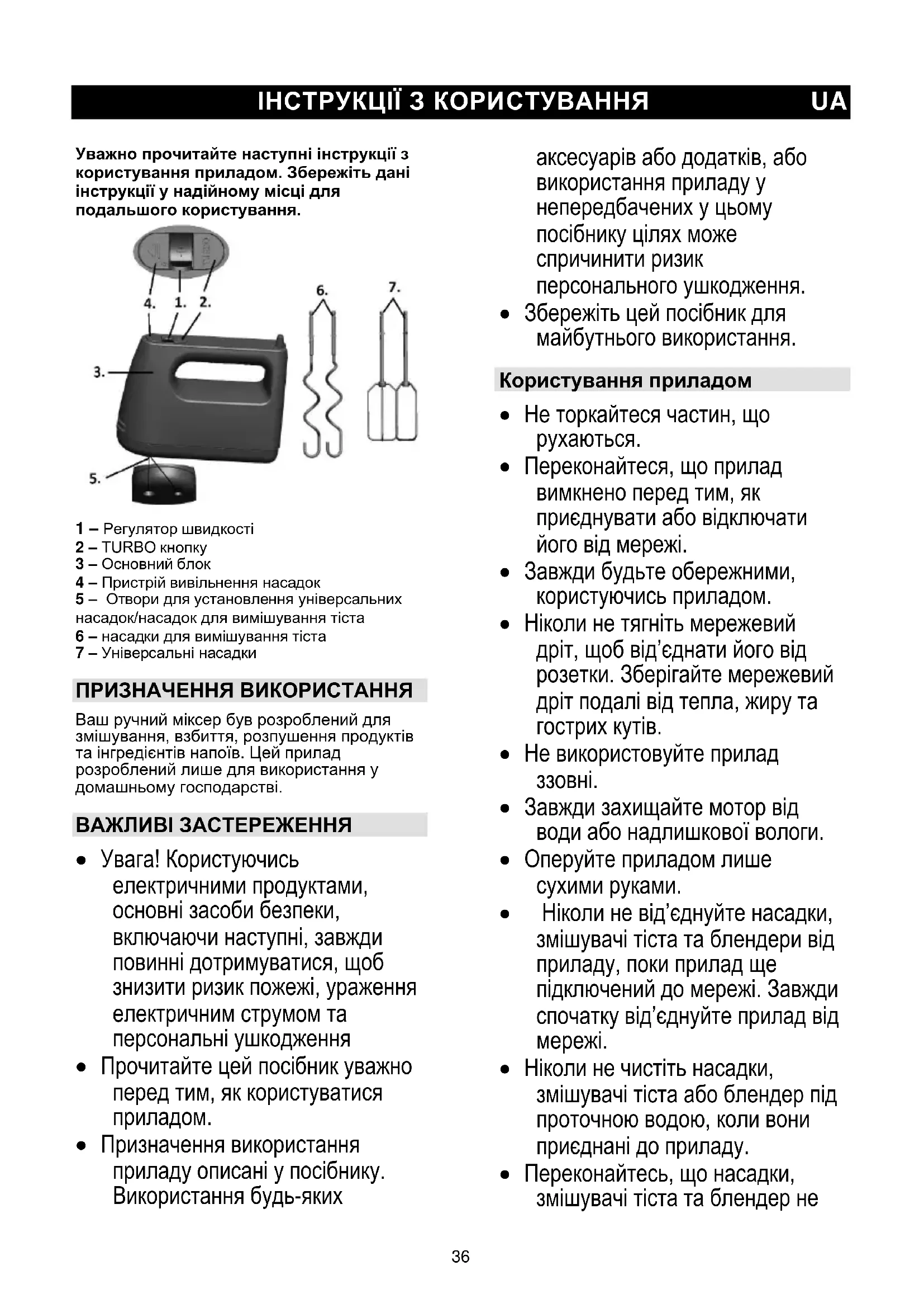 Запазваме си правата за извършване на модификации!36 ІНСТРУКЦІЇ З КОРИСТУВАННЯ UA Уважно прочитайте наступні інструкції з користування приладом. Збережіть дані інструкції у надійному місці для подальшого користування. 1 – Регулятор швидкості 2 – TURBO кнопку 3 – Основний блок 4 – Пристрій вивільнення насадок 5 – Отвори для установлення універсальних насадок/насадок для вимішування тіста 6 – насадки для вимішування тіста 7 – Універсальні насадки ПРИЗНАЧЕННЯ ВИКОРИСТАННЯ Ваш ручний міксер був розроблений для змішування, взбиття, розпушення продуктів та інгредієнтів напоїв. Цей прилад розроблений лише для використання у домашньому господарстві. ВАЖЛИВІ ЗАСТЕРЕЖЕННЯ