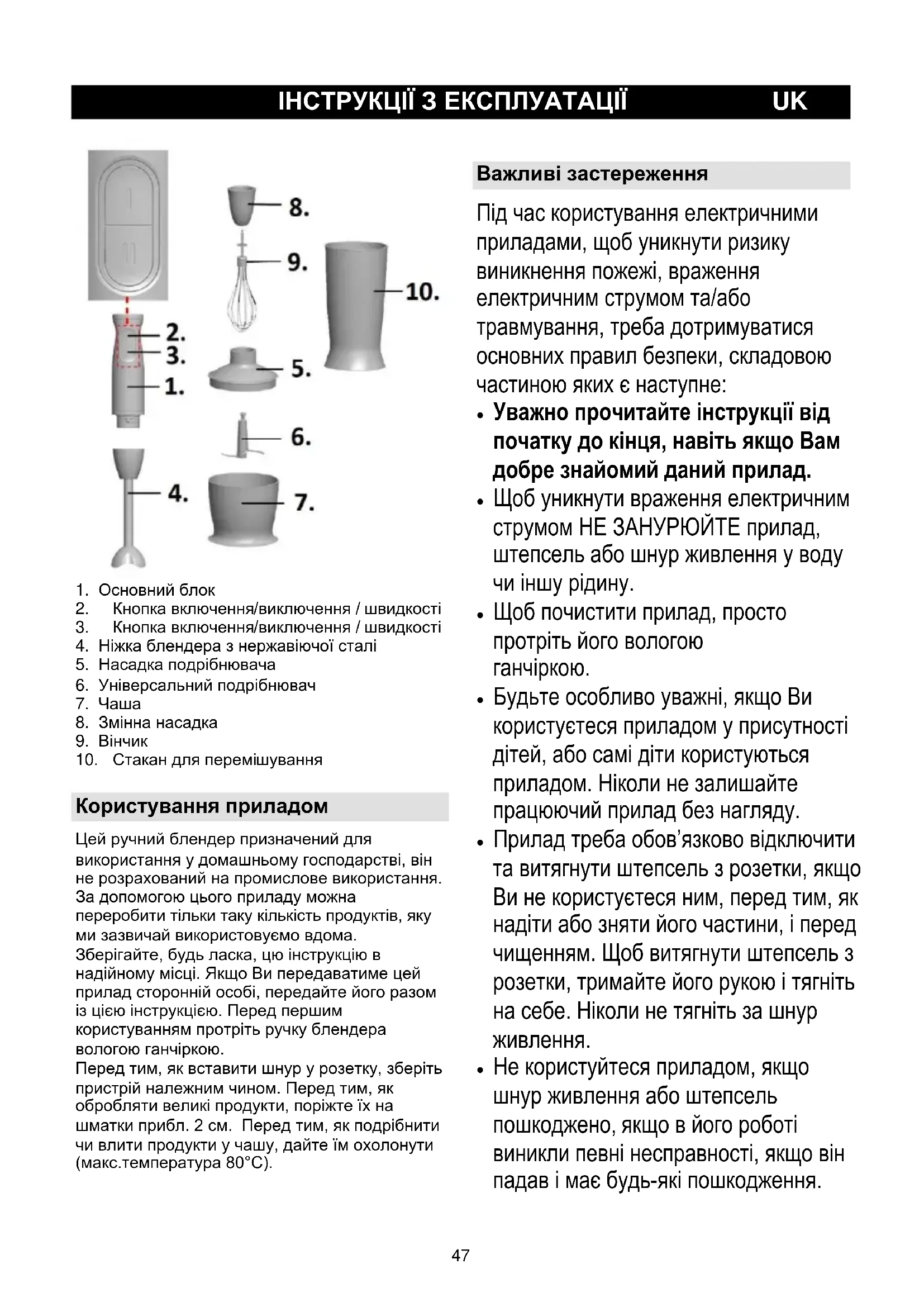 Користування приладом Цей ручний блендер призначений для використання у домашньому господарстві, він не розрахований на промислове використання. За допомогою цього приладу можна переробити тільки таку кількість продуктів, яку ми зазвичай використовуємо вдома. Зберігайте, будь ласка, цю інструкцію в надійному місці. Якщо Ви передаватиме цей прилад сторонній особі, передайте його разом із цією інструкцією. Перед першим користуванням протріть ручку блендера вологою ганчіркою. Перед тим, як вставити шнур у розетку, зберіть пристрій належним чином. Перед тим, як обробляти великі продукти, поріжте їх на шматки прибл. 2 см. Перед тим, як подрібнити чи влити продукти у чашу, дайте їм охолонути (макс.температура 80°C). Важливі застереження Під час користування електричними приладами, щоб уникнути ризику виникнення пожежі, враження електричним струмом та/або травмування, треба дотримуватися основних правил безпеки, складовою частиною яких є наступне: