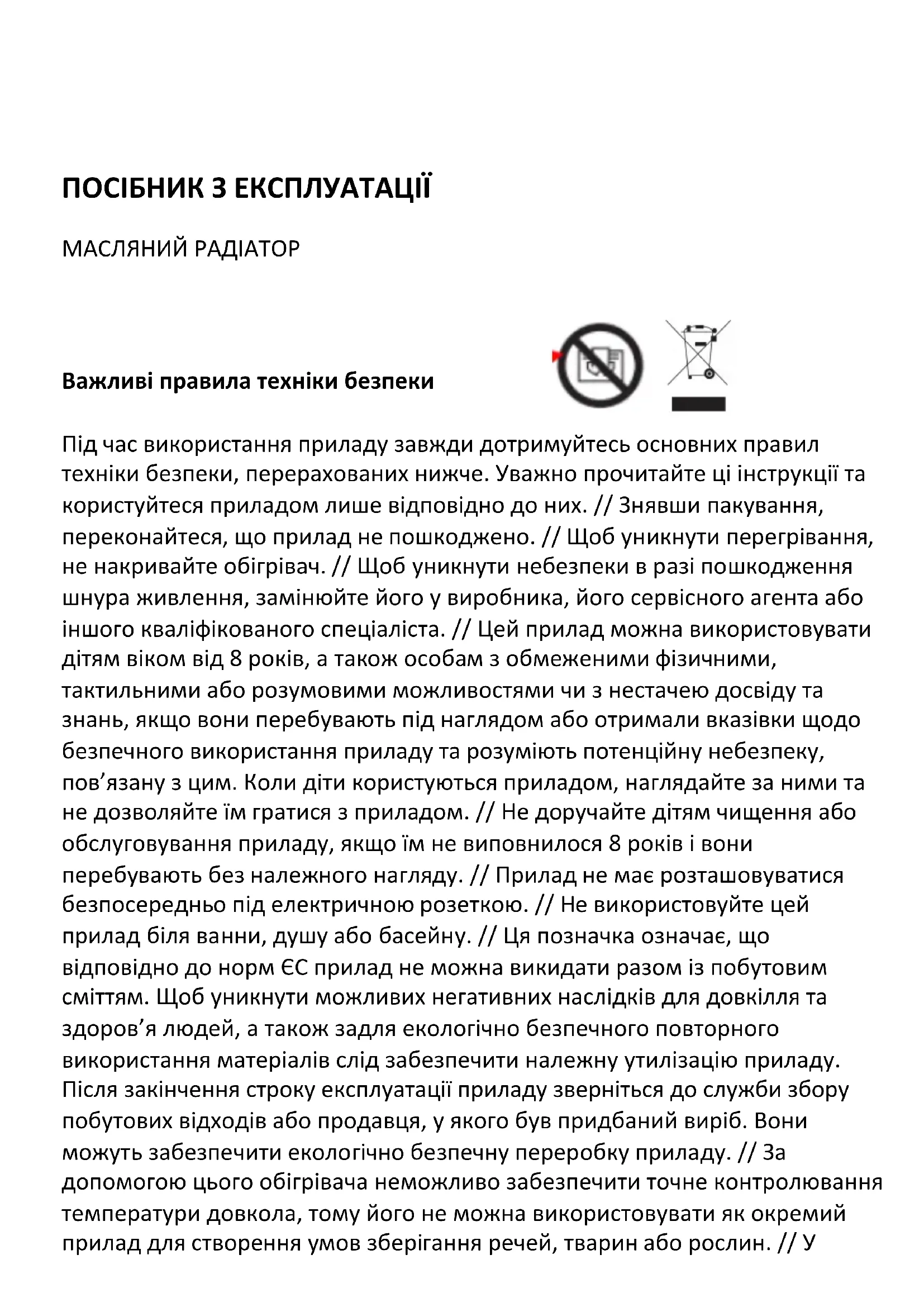 RENJE VÁM ŽELÁ PRÍJEMNÝ ZÁŽITOK PRI POUŽÍVANÍ VÁŠHO SPOTREBIČA.ПОСІБНИК З ЕКСПЛУАТАЦІЇ МАСЛЯНИЙ РАДІАТОР Важливі правила техніки безпеки Під час використання приладу завжди дотримуйтесь основних правил техніки безпеки, перерахованих нижче. Уважно прочитайте ці інструкції та користуйтеся приладом лише відповідно до них. // Знявши пакування, переконайтеся, що прилад не пошкоджено. // Щоб уникнути перегрівання, не накривайте обігрівач. // Щоб уникнути небезпеки в разі пошкодження шнура живлення, замінюйте його у виробника, його сервісного агента або іншого кваліфікованого спеціаліста. // Цей прилад можна використовувати дітям віком від 8 років, а також особам з обмеженими фізичними, тактильними або розумовими можливостями чи з нестачею досвіду та знань, якщо вони перебувають під наглядом або отримали вказівки щодо безпечного використання приладу та розуміють потенційну небезпеку, пов’язану з цим. Коли діти користуються приладом, наглядайте за ними та не дозволяйте їм гратися з приладом. // Не доручайте дітям чищення або обслуговування приладу, якщо їм не виповнилося 8 років і вони перебувають без належного нагляду. // Прилад не має розташовуватися безпосередньо під електричною розеткою. // Не використовуйте цей прилад біля ванни, душу або басейну. // Ця позначка означає, що відповідно до норм ЄС прилад не можна викидати разом із побутовим сміттям. Щоб уникнути можливих негативних наслідків для довкілля та здоров’я людей, а також задля екологічно безпечного повторного використання матеріалів слід забезпечити належну утилізацію приладу. Після закінчення строку експлуатації приладу зверніться до служби збору побутових відходів або продавця, у якого був придбаний виріб. Вони можуть забезпечити екологічно безпечну переробку приладу. // За допомогою цього обігрівача неможливо забезпечити точне контролювання температури довкола, тому його не можна використовувати як окремий прилад для створення умов зберігання речей, тварин або рослин. // Урадіаторі міститься точна кількість спеціального мастила. Ремонт, за якого потрібно відкривати резервуар із мастилом, повинен здійснювати тільки виробник або його сервісний агент. Крім того, їх слід повідомити в разі витікання мастила. Утилізуючи прилад, дотримуйтеся правил, що стосуються утилізації мастила. // 10. За допомогою цього обігрівача неможливо забезпечити точне контролювання температури довкола, тому його не можна використовувати як окремий прилад для створення умов зберігання речей, тварин або рослин. // Цей прилад призначено тільки для побутового використання.