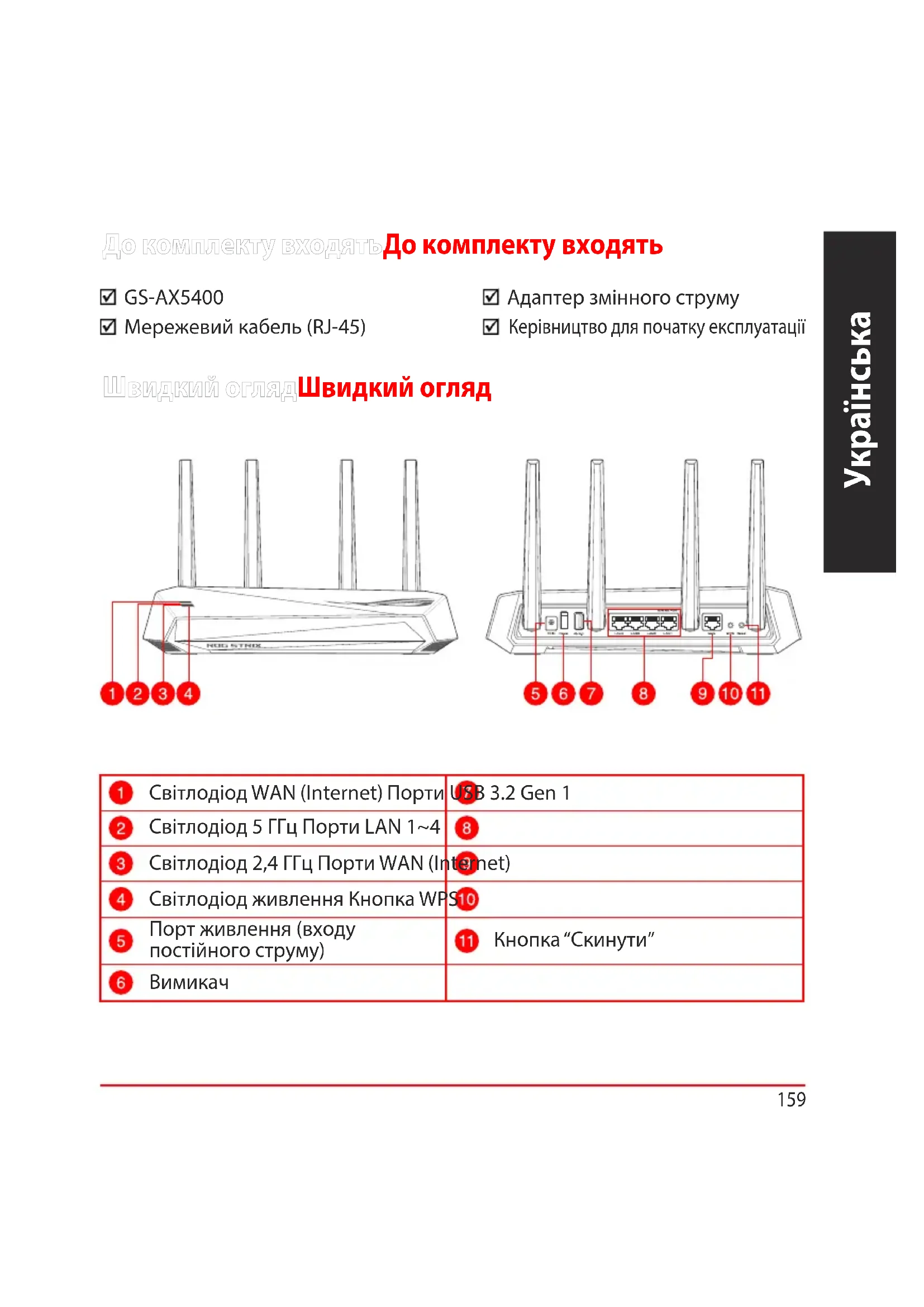 Швидкий оглядШвидкий огляд До комплекту входятьДо комплекту входять GS-AX5400 Адаптер змінного струму Мережевий кабель (RJ-45) Керівництво для початку експлуатації Світлодіод WAN (Internet) Порти USB 3.2 Gen 1 Світлодіод 5 ГГц Порти LAN 1~4 Світлодіод 2,4 ГГц Порти WAN (Internet) Світлодіод живлення Кнопка WPS Порт живлення (входу постійного струму) Кнопка “Скинути” Вимикач160