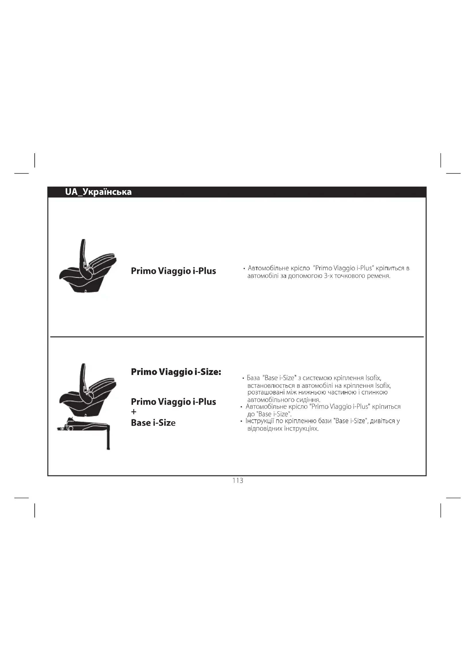 - Інструкції по кріпленню бази "Base i-Size", дивіться у відповідних інструкціях. UA_Українська Primo Viaggio i-Plus Primo Viaggio i-Size: Primo Viaggio i-Plus