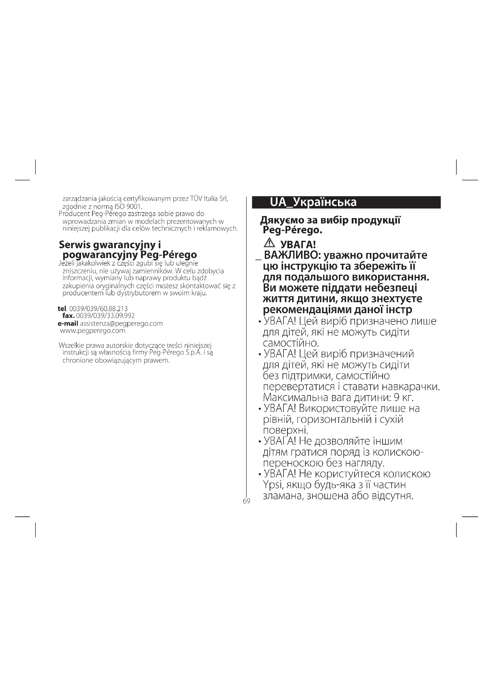 - УВАГА! Не користуйтеся колискою Ypsi, якщо будь-яка з її частин зламана, зношена або відсутня. zarządzania jakością certyfikowanym przez TÜV Italia Srl, zgodnie z normą ISO 9001. Producent Peg-Pérego zastrzega sobie prawo do wprowadzania zmian w modelach prezentowanych w niniejszej publikacji dla celów technicznych i reklamowych. Serws gwarancyjny pogwarancyjny Peg-Pérego Jeżeli jakakolwiek z części zgubi się lub ulegnie zniszczeniu, nie używaj zamienników. W celu zdobycia informacji, wymiany lub naprawy produktu bądź zakupienia oryginalnych części możesz skontaktować się z producentem lub dystrybutorem w swoim kraju. tel. 0039/039/60.88.213 fax. 0039/039/33.09.992 e-mail assistenza@pegperego.com www.pegperego.com Wszelkie prawa autorskie dotyczące treści niniejszej instrukcji są własnością firmy Peg-Pérego S.p.A. i są chronione obowiązującym prawem.70 та дно на наявність пошкоджень і слідів зношування.