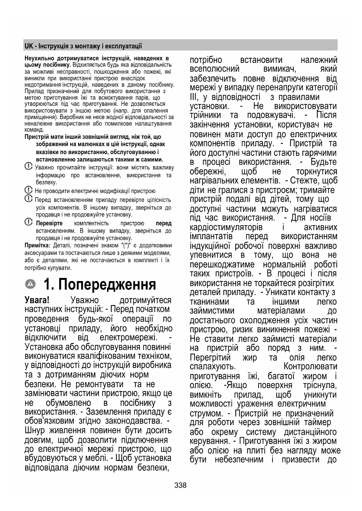 Увага! Уважно дотримуйтеся наступних інструкцій: - Перед початком проведення будь-якої операції по установці приладу, його необхідно відключити від електромережі. - Установка або обслуговування повинні виконуватися кваліфікованим техніком, у відповідності до інструкцій виробника та з дотриманням діючих норм безпеки. Не ремонтувати та не замінювати частини пристрою, якщо це не обумовлено в посібнику з використання. - Заземлення приладу є обов'язковим згідно законодавства. - Шнур живлення повинен бути досить довгим, щоб дозволити підключення до електричної мережі пристрою, що вбудовуються у меблі. - Щоб установка відповідала діючим нормам безпеки, потрібно встановити належний всеполюсний вимикач, який забезпечить повне відключення від мережі у випадку перенапруги категорії III, у відповідності з правилами установки. - Не використовувати трійники та подовжувачі. - Після закінчення установки, користувач не повинен мати доступ до електричних компонентів приладу. - Пристрій та його доступні частини стають гарячими в процесі використання. - Будьте обережні, щоб не торкнутися нагрівальних елементів. - Стежте, щоб діти не гралися з пристроєм; тримайте пристрій подалі від дітей, тому що доступні частини можуть нагріватися під час використання. - Для носіїв кардіостимуляторів і активних імплантатів перед використанням індукційної робочої поверхні важливо упевнитися в тому, що вона не перешкоджатиме нормальній роботі таких пристроїв. - В процесі і після використання не торкайтеся розігрітих деталей приладу. - Уникати контакту з тканинами та іншими легко займистими матеріалами до достатнього охолодження усіх частин пристрою, ризик виникнення пожежі - Не ставити легко займисті матеріали на пристрій або поряд з ним. - Перегрітий жир та олія легко спалахують. Контролювати приготування їжі, багатої жиром і олією. -Якщо поверхня тріснула, вимкніть прилад, щоб уникнути можливості ураження електричним струмом. - Пристрій не призначений для роботи через зовнішній таймер або окрему систему дистанційного керування. - Приготування їжі з жиром або олією на плиті без нагляду може бути небезпечним і призвести до339 пожежі. - Слід контролювати процес приготування. Процес короткострокового приготування потрібно постійно контролювати. - НІКОЛИ не намагайтеся загасити вогонь за допомогою води. Навпаки, вимкнути прилад і загасити полум'я, наприклад, кришкою або протипожежною ковдрою. Небезпека виникнення пожежі: не ставте предмети на варильні поверхні. - Не використовувати парові очищувачі, ризик ураження електричним струмом. - Не ставте металеві предмети, такі як ножі, вилки, ложки та кришки на поверхню, оскільки вони можуть нагріватися. - Перед підключенням приладу до електричної мережі: перевірте табличку з паспортними даними (на нижній частині пристрою), щоб упевнитися, що напруга і потужність відповідають значенням мережі та електричної розетки. У випадку сумнівів звернутися до кваліфікованого електрика. Важливо: - Після використання, вимкніть робочу поверхню через панель управління, не покладаючись на детектор кухонного посуду. - Уникати розливу рідини, тому під час кип'ятіння або розігріву рідин зменшуйте подачу тепла. - Не залишати елементи нагрівання увімкненими з порожніми каструлями або сковорідками або без них. - По завершенню приго