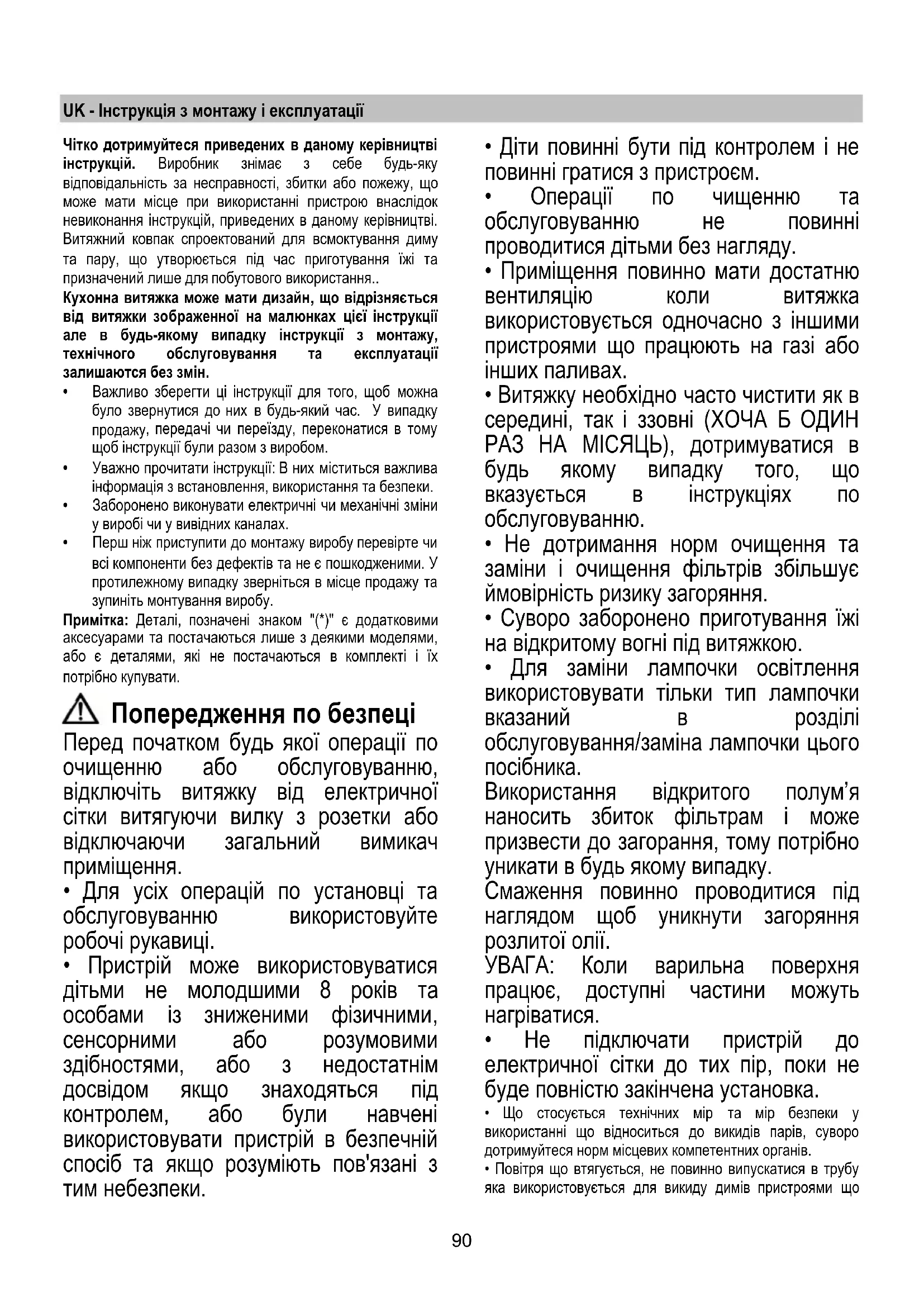 - Приміщення повинно мати достатню вентиляцію коли витяжка використовується одночасно з іншими пристроями що працюють на газі або інших паливах.