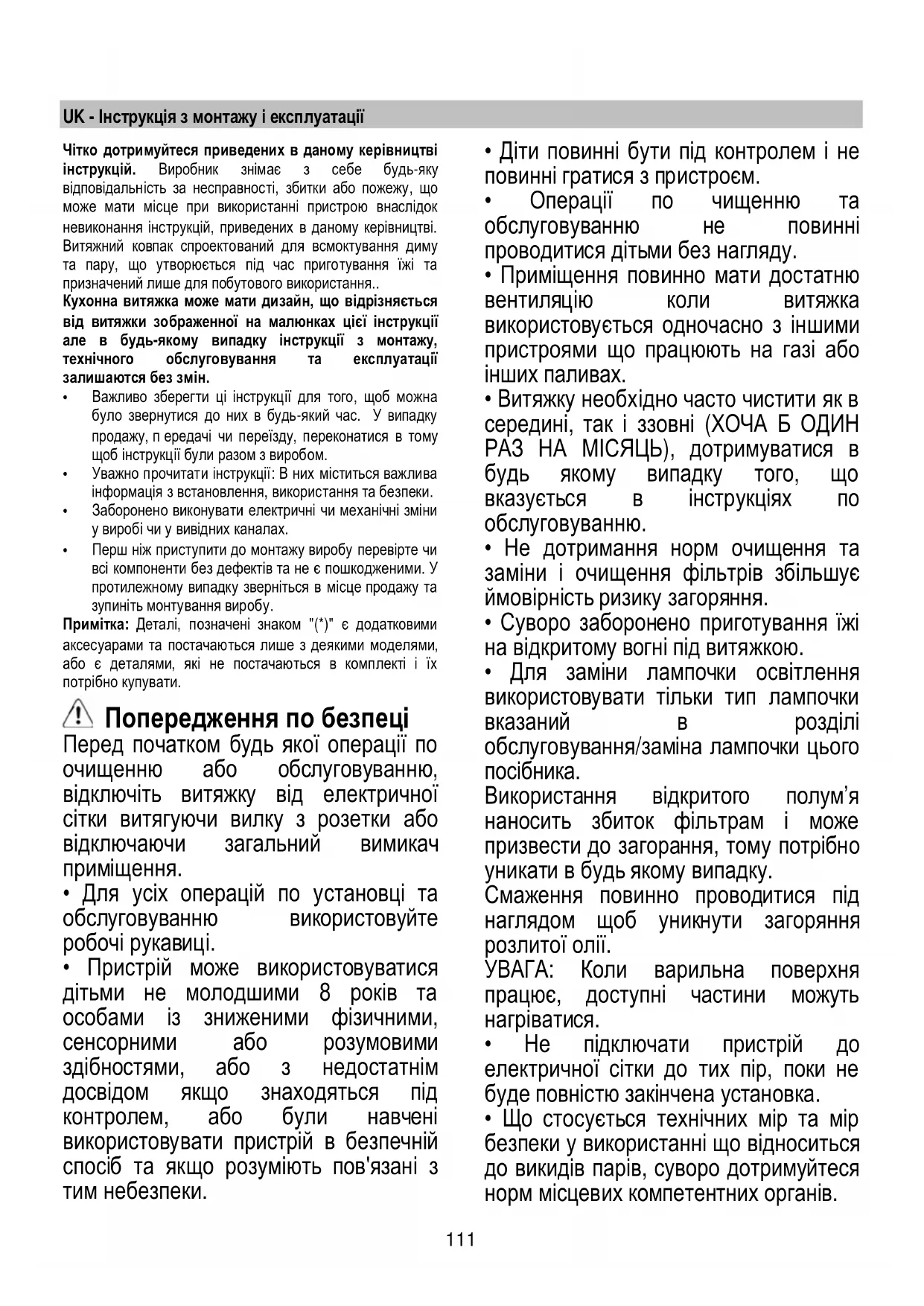 - Перш ніж приступити до монтажу виробу перевірте чи всі компоненти без дефектів та не є по шкодженими. У протилежному випадку зверніться в місце продажу та зупиніть монтування виробу. Примітка: Деталі, позначені знаком "(*)" є додатковими аксесуарами та постачаються лише з деякими моделями, або є деталями, які не постачаються в комплекті і їх потрібно купувати. Попередження по безпеці Перед початком будь якої операції по очищенню або обслуговуванню, відключіть витяжку від електричної сітки витягуючи вилку з розетки або відключаючи загальний вимикач приміщення.